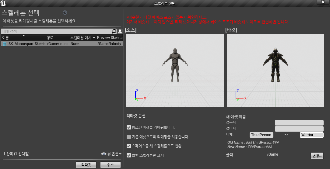 리타깃할 Warrior 스켈레톤을 선택하고, 편의를 위해 접두사를 바꾼후 리타깃을 누르면 된다. 이제 Warrior 스켈레톤도 기본 Mannequin 의 애니메이션을 사용할 수 있게 되었다.