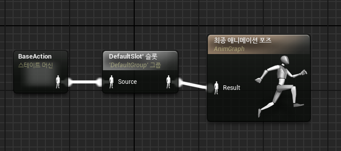 애니메이션 블루프린트에서 몽타주를 재생하기 위해서는 몽타주 재생 노드를 애님 그래프에 추가해야 한다. 우리는 모든 상황에서 몽타주를 재생할 예정이므로 애님 그래프의 최종 애니메이션 포즈와 스테이트 머신 사이에 몽타주 재생 노드를 추가했다. 몽타주 파일을 잘 보면 슬록이 현재 DefaultGroup.DefaultSlot 으로 되어 있는 것을 확인해 볼 수 있다.