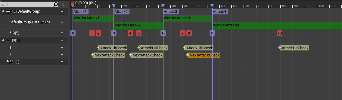 위의 Attack(1~4) 섹션에는 이미 넣어놓은 WarriorAttack(1~4) 애니메이션이 각각 하나씩 할당이 되어 있다. 아래 줄들을 보면 노티파이가 있다. 노티파이는 아래 섹션에서 자세히 다루도록 한다.