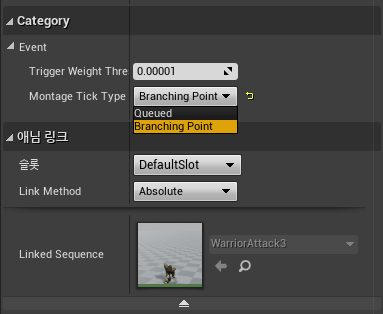 애니메이션 노티파이를 설정한 후에는 해당 프레임에 즉각적으로 반응하는 방식인 Branching Point 값으로 틱 타입(Tick Type)을 변경하는 것이 좋다. 기본값인 Queued 로 설정하게 되면 비동기 방식으로 신호를 받게 돼서 적절한 타이밍에 신호를 받는 것을 놓치게 될 수 있다. Queued 값은 주로 타이밍에 민감하지 않은 사운드나 이펙트를 발생시킬 때 사용하는 것이 적합하다.