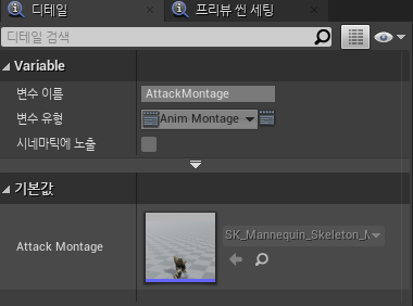 ABAnimInstance 에서 만든 AttackMontage 는 다음과 같이 변수가 잘 선언되어 있음을 확인할 수 있다.