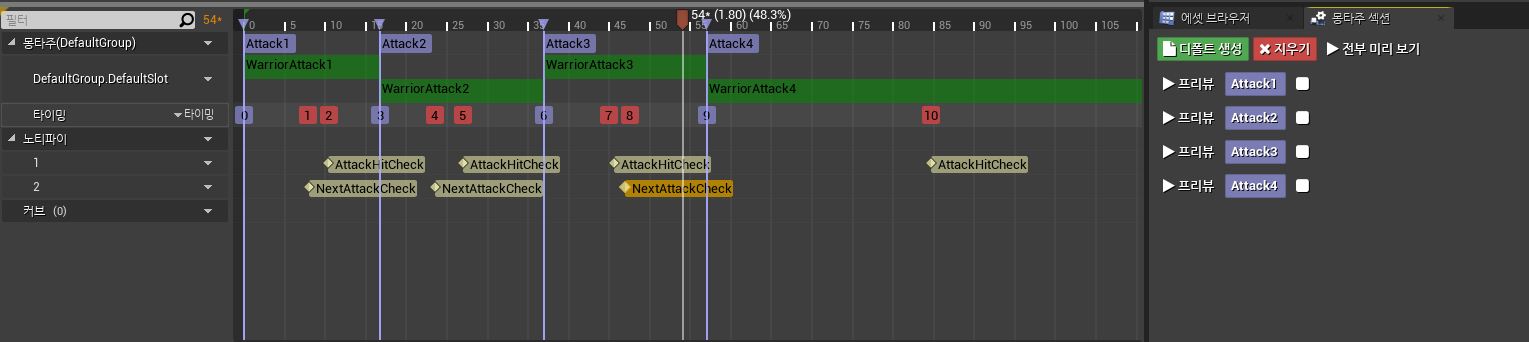 위의 Attack(1~4) 섹션에는 이미 넣어놓은 WarriorAttack(1~4) 애니메이션이 각각 하나씩 할당이 되어 있다. 아래 줄들을 보면 노티파이가 있다. 노티파이는 아래 섹션에서 자세히 다루도록 한다.