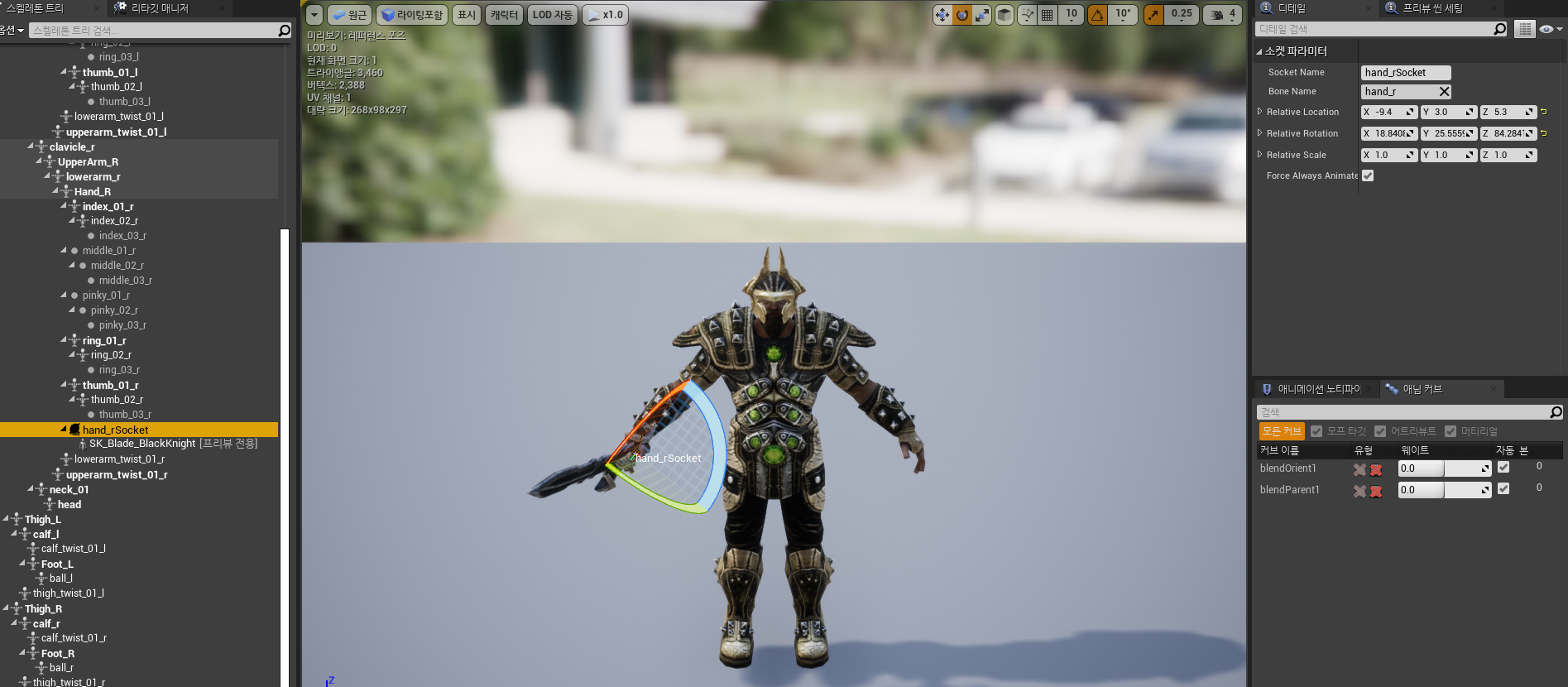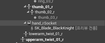 무기는 메시에 착용해야 캐릭터 애니메이션에 따라 무기가 움직인다. 언리얼은 소켓이라는 시스템을 제공하는데, 우리가 사용하는 워리어 캐릭터의 스켈레탈 메시에는 이미 hand_rSocket 이라는 이름의 소켓이 생성돼 있다.