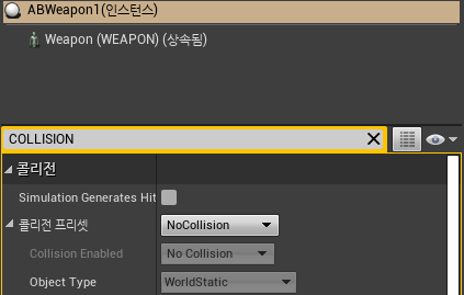 여기서는 무기 액터의 루트 컴포넌트인 스켈레탈 메시 컴포넌트의 충돌 설정(프리셋)을 NoCollision 으로 지정했다. 액터를 월드에 배치한 후 콜리전을 확인해 보자.