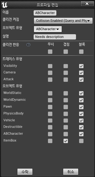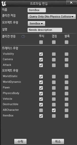 그리고 ItemBox 라는 프리셋을 하나 추가한다. 해당 프리셋은 ABCharacter 에 대해서는 '겹침' 을 구현해야 한다.