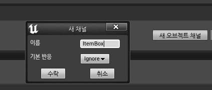 이제 폰이 아이템을 획득하도록 아이템 상자에 오브젝트 채널을 추가한다. 프로젝트 설정의 콜리전 메뉴로 가서 ItemBox 라는 오브젝트 채널을 하나 생성하고 기본 반응은 무시로 지정한다.