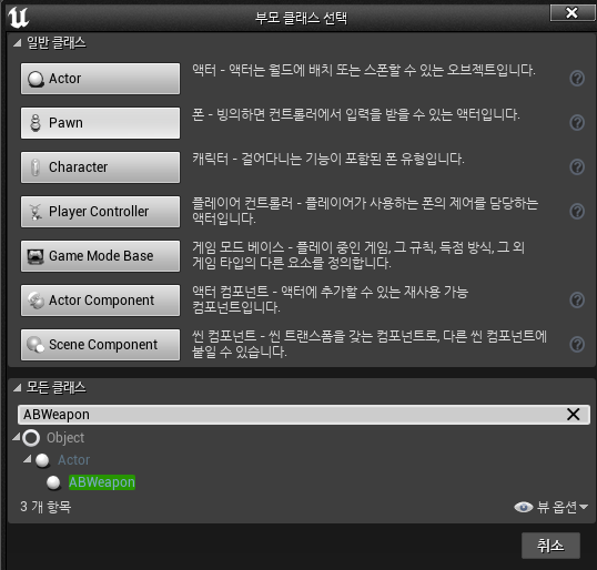 액터에 고정시켜 무기를 장착하지 않고 때에 따라 무기를 바꿀 수 있도록 만들어 보자. 먼저, 무기를 액터로 분리해 만든다. ABWeapon 이라는 무기 액터 클래스(C++)를 생성한다.