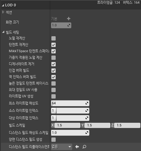 아이템 상자에 사용할 스태틱메시는 InfinityBladeGrassLands 의 SM_Env_Breakables_Box1 애셋을 선택한다. 박스의 크기가 작으면 스태틱메시의 LOD 0 항목에서 빌드 스케일을 늘려준다. 여기서는 1.5 로 설정했다.