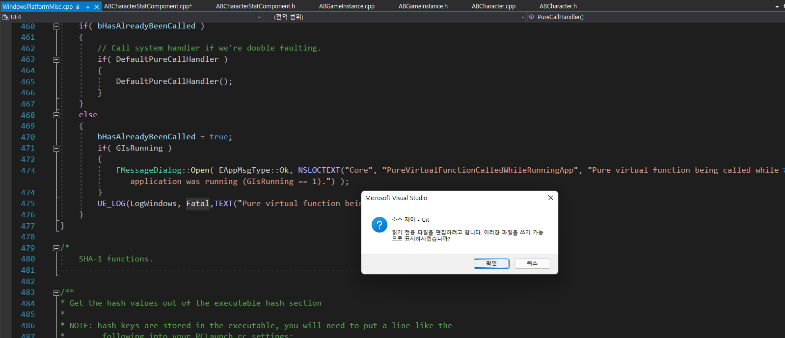 일단 구글링을 조금 해보다가, 임시 방편으로 해당 소스코드를 약간 수정하는 것으로 쇼부(?) 를 보기로 했다. 지금 당장은 진득하게 에러를 고칠 시간이 조금 부족한 상황이다.. 일단 해당 파일을 비주얼 스튜디오 프로젝트의 ++UE4 폴더 내부에서 찾자.