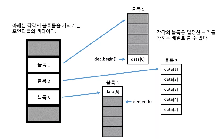 덱은 Random Access Iterator 를 사용하여 임의의 위치의 원소에 접근할 수 있으며, 맨뒤/맨앞의 원소를 추가/제거하는 작업도 O(1) 으로 수행이 가능하다. 임의의 위치에 원소를 제거/추가하는 작업은 O(n) 으로 수행 가능하다. 덱의 메모리 구조는 다음과 같다.