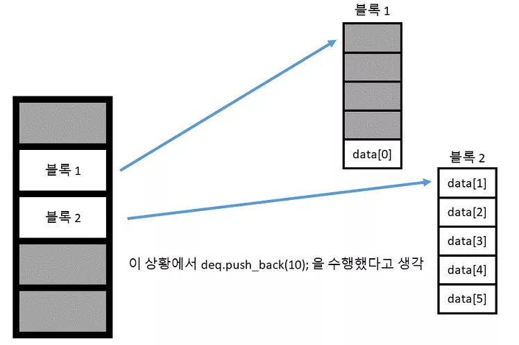 덱은 벡터와 달리 원소들이 메모리상에서 연속적으로 존재하지 않는다. 대신 블록별로 메모리가 저장되고, 이를 위해 추가적인 메모리를 필요로 한다. 그렇다면 덱은 어째서 맨 뒤에 요소를 추가하는 작업이 O(1) 밖에 들지 않을까? 다음과 같은 경우를 보자.