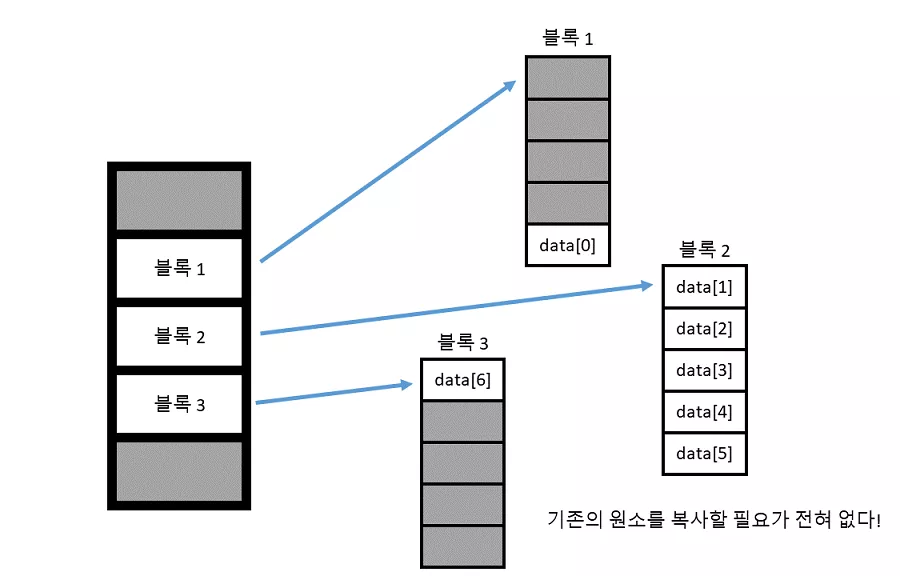 삽입 전과 삽입 후를 보면, 벡터처럼 기존 영역을 재할당하지 않고, 그냥 블록을 하나 더 추가하는 방식으로 메모리 부족 문제를 해결했다! 따라서 평균적으로 덱이 벡터보다 더 빠르게 작동하게 된다. 특히 맨 처음과 끝에 원소를 추가하는 작업을 많이 할 경우, 덱을 사용하면 유리하다.