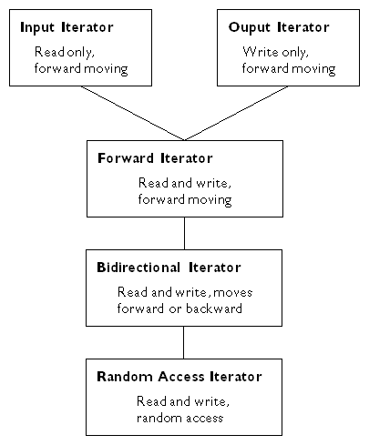 사실 반복자에는 여러 종류가 있고, 각각의 컨테이너는 이에 맞는 반복자를 상속받아 사용한다. 상속관계는 다음과 같다.
