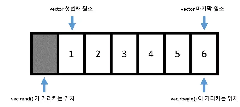 벡터의 반복자에는 추가적으로 const_interator 와 reverse_iterator 가 있는데, const_iterator 는 이름에서 유추할 수 있듯 상수 반복자로, iterator 가 가리키는 값을 바꿀 수 없는 속성을 가진다. reverse_iterator 는 다음과 같이 역으로 벡터를 순회할 수 있는 반복자이다.