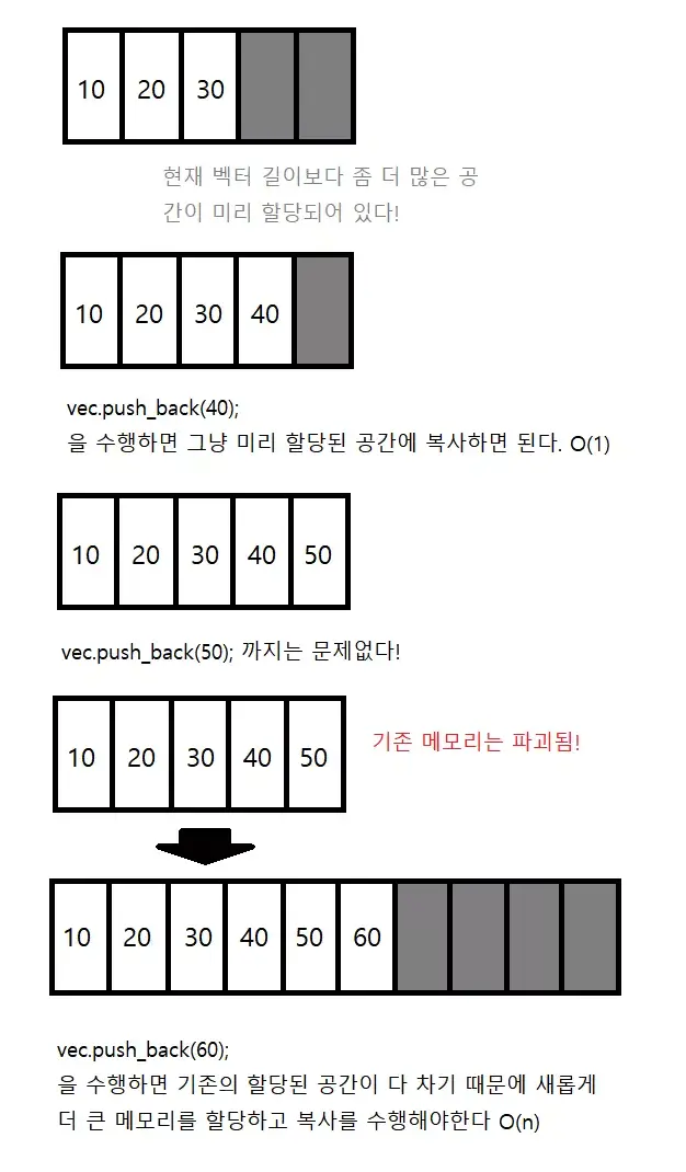 벡터는 메모리가 연속된 공간에 저장된다. push_back 연산이 계속 들어와 Capacity (할당된 공간) 보다 더 많은 길이가 되면, 기본 메모리를 파괴하고 capacity 를 늘려 영역을 할당한다. 따라서 이 경우, 배열을 새로 구성하기 때문에 실제 시간은 O(n) 이지만 매번 재할당을 하지 않아 맨 끝에 요소를 삽입하는 경우의 시간 복잡도는 amortized O(1) 이라고 부른다. ( 평균적으로 O(1) 이지만 최악의 경우 O(n) )