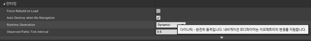 NPC 가 플레이어를 쫓아올 수 있도록 프로젝트 세팅의 네비게이션 메시 설정에서 Runtime Generation 속성의 값을 Dynamic 으로 변경해준다.