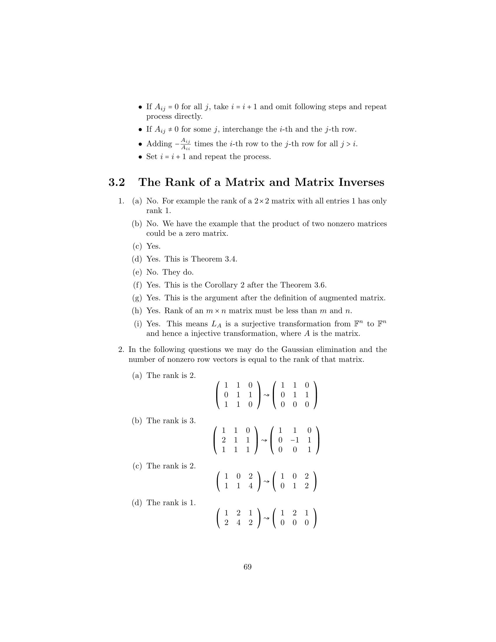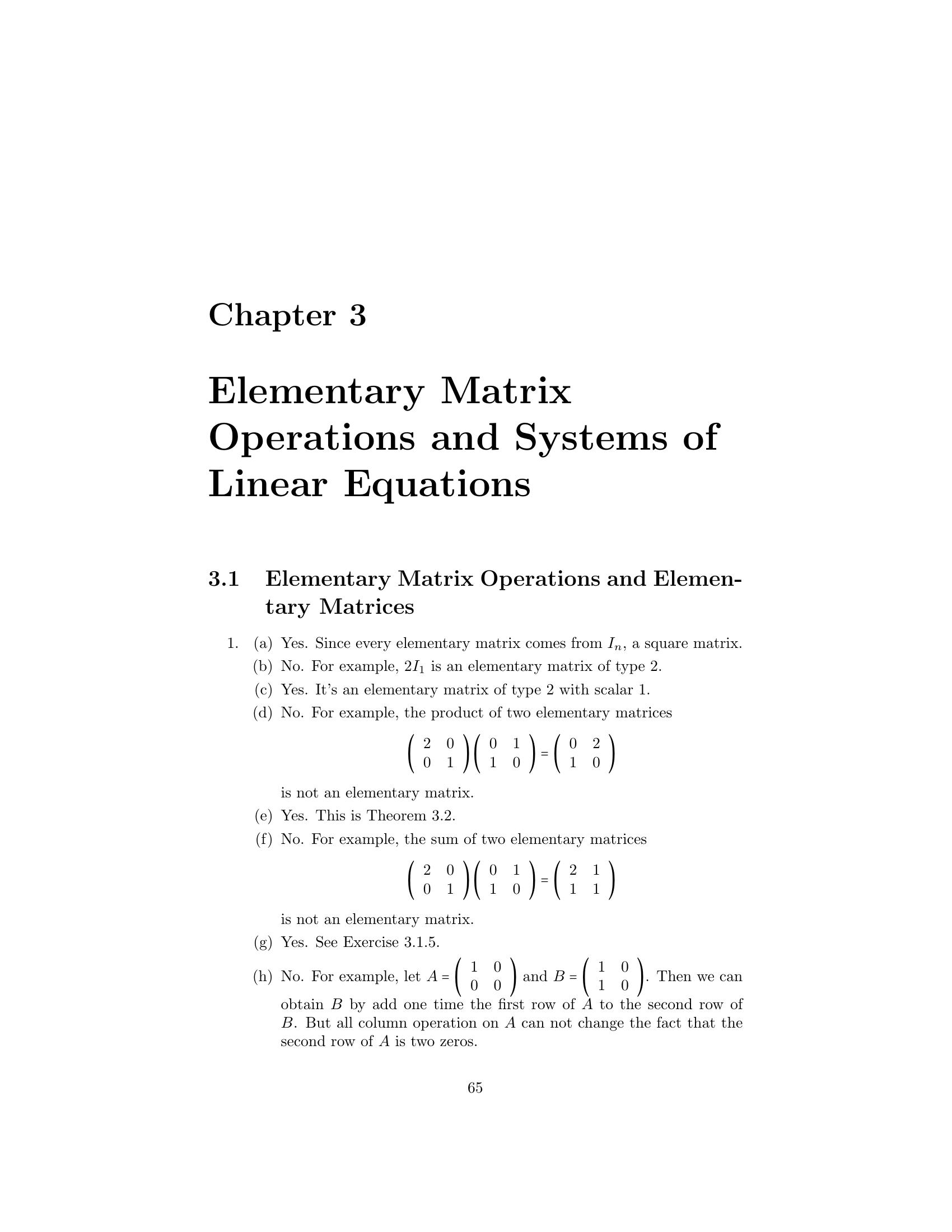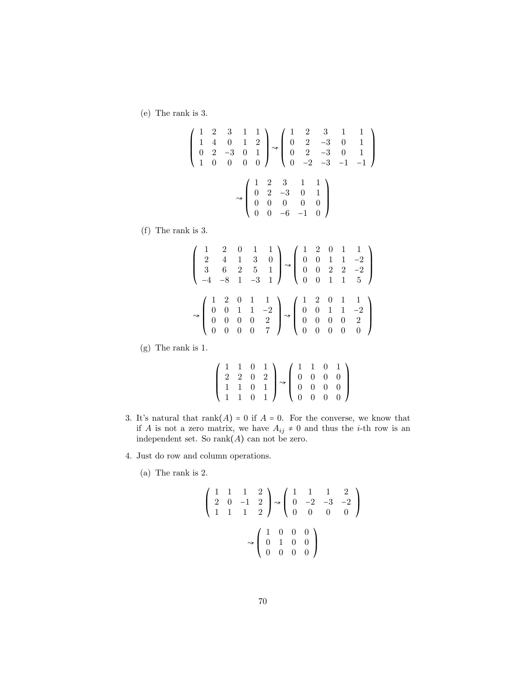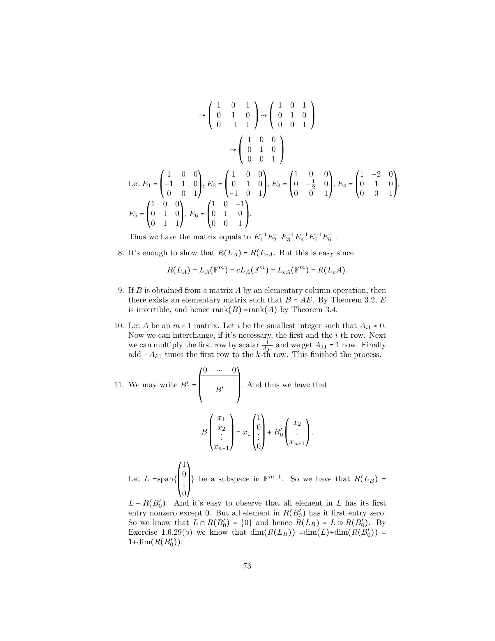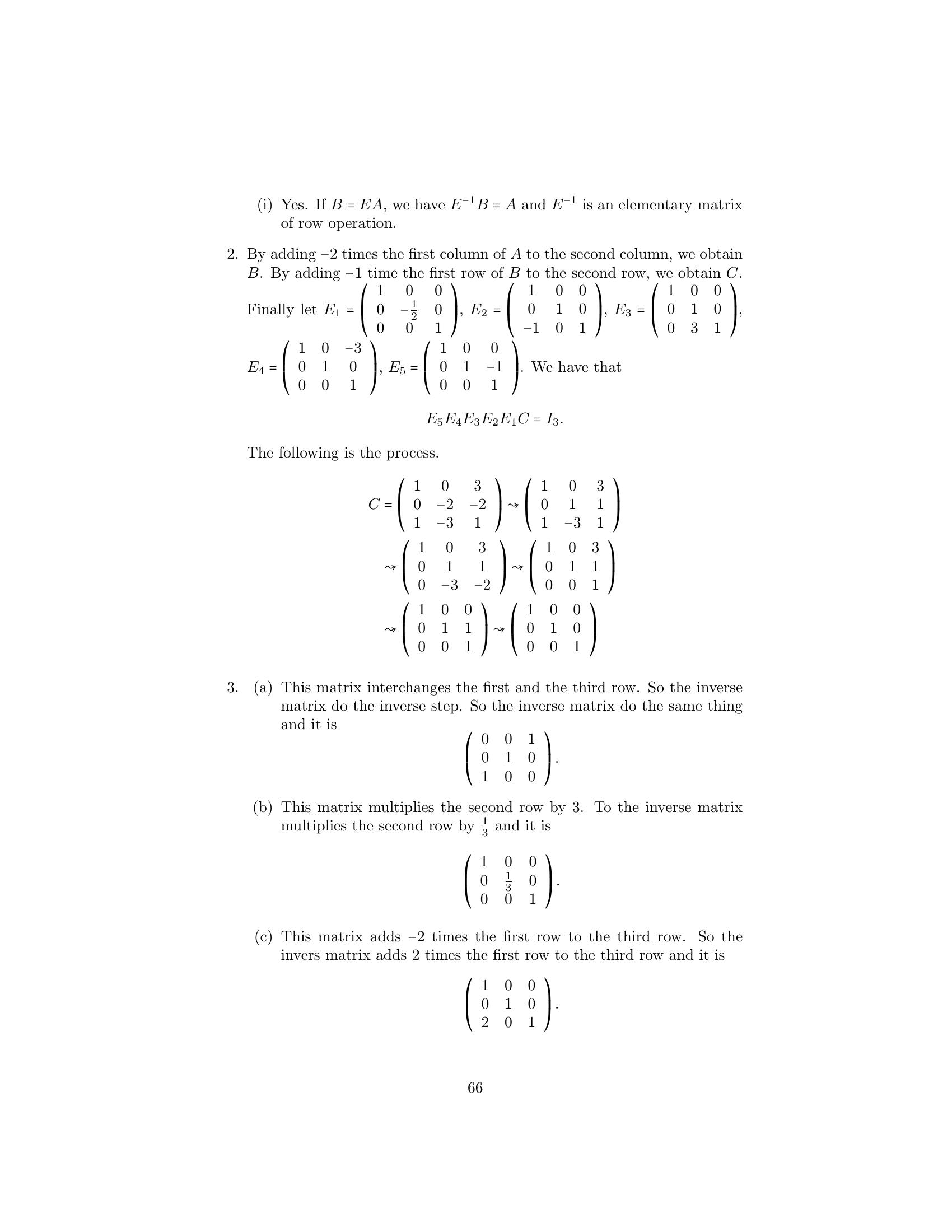 1. Label the following statements as true or false. (a) An elementary matrix is always square. (b) The only entries of an elementary matrix are zeros and ones. (c) The n × n identity matrix is an elementary matrix. (d) The product of two n × n elementary matrices is an elementary matrix. (e) The inverse of an elementary matrix is an elementary matrix. (f ) The sum of two n×n elementary matrices is an elementary matrix. (g) The transpose of an elementary matrix is an elementary matrix. (h) If B is a matrix that can be obtained by performing an elementary row operation on a matrix A, then B can also be obtained by performing an elementary column operation on A. (i) If B is a matrix that can be obtained by performing an elemen- tary row operation on a matrix A, then A can be obtained by performing an elementary row operation on B. 2. Let ⎛ ⎞ ⎛ ⎞ ⎛ ⎞ 1 2 3 1 0 3 1 0 3 A = ⎝1 0 1⎠ , B = ⎝1 −2 1⎠ , and C = ⎝0 −2 −2⎠ . 1 −1 1 1 −3 1 1 −3 1 Find an elementary operation that transforms A into B and an elemen- tary operation that transforms B into C. By means of several additional operations, transform C into I3 . 3. Use the proof of Theorem 3.2 to obtain the inverse of each of the fol- lowing elementary matrices. ⎛ ⎞ ⎛ ⎞ ⎛ ⎞ 0 0 1 1 0 0 1 0 0 (a) ⎝0 1 0⎠ (b) ⎝0 3 0⎠ (c) ⎝ 0 1 0⎠ 1 0 0 0 0 1 −2 0 1 4.Prove the assertion made on page 149: Any elementary n×n matrix can be obtained in at least two ways—either by performing an elementary row operation on In or by performing an elementary column operation on In . 5.6.Prove that E is an elementary matrix if and only if E t is. Let A be an m × n matrix. Prove that if B can be obtained from A by an elementary row [column] operation, then B t can be obtained from At by the corresponding elementary column [row] operation. 7. Prove Theorem 3.1. 152 Chap. 3 Elementary Matrix Operations and Systems of Linear Equations 8.Prove that if a matrix Q can be obtained from a matrix P by an elemen- tary row operation, then P can be obtained from Q by an elementary matrix of the same type. Hint: Treat each type of elementary row operation separately. 9.Prove that any elementary row [column] operation of type 1 can be obtained by a succession of three elementary row [column] operations of type 3 followed by one elementary row [column] operation of type 2. 10. Prove that any elementary row [column] operation of type 2 can be obtained by dividing some row [column] by a nonzero scalar. 11. Prove that any elementary row [column] operation of type 3 can be obtained by subtracting a multiple of some row [column] from another row [column]. 12. Let A be an m × n matrix. Prove that there exists a sequence of elementary row operations of types 1 and 3 that transforms A into an upper triangular matrix. 1. Label the following statements as true or false. (a)(b)(c)(d)(e)(f )(g)(h)(i)The rank of a matrix is equal to the number of its nonzero columns. The product of two matrices always has rank equal to the lesser of the ranks of the two matrices. The m × n zero matrix is the only m × n matrix having rank 0. Elementary row operations preserve rank. Elementary column operations do not necessarily preserve rank. The rank of a matrix is equal to the maximum number of linearly independent rows in the matrix. The inverse of a matrix can be computed exclusively by means of elementary row operations. The rank of an n × n matrix is at most n. An n × n matrix having rank n is invertible. 2. Find the rank of the following matrices. ⎛ ⎞ ⎛ ⎞ 1 1 0 1 1 0 (a) ⎝0 1 1⎠ (b) ⎝2 1 1⎠ (c) 1 0 2 1 1 4 1 1 0 1 1 1 166 Chap. 3 Elementary Matrix Operations and Systems of Linear Equations ⎛ ⎞ 1 2 3 1 1 1 2 1 ⎜1 4 0 1 2⎟ (d) (e) ⎜ ⎟ 2 4 2 ⎝0 2 −3 0 1⎠ 1 0 0 0 0 ⎛ ⎞ ⎛ ⎞ 1 2 0 1 1 1 1 0 1 ⎜ 2 4 1 3 0⎟ ⎜2 2 0 2⎟ (f ) ⎜ ⎟ (g) ⎜ ⎟ ⎝ 3 6 2 5 1⎠ ⎝1 1 0 1⎠ −4 −8 1 −3 1 1 1 0 1 3.Prove that for any m × n matrix A, rank(A) = 0 if and only if A is the zero matrix. 4. Use elementary row and column operations to transform each of the following matrices into a matrix D satisfying the conditions of Theo- rem 3.6, and then determine the rank of each matrix. ⎛ ⎞ ⎛ ⎞ 1 1 1 2 2 1 (a) ⎝2 0 −1 2⎠ (b) ⎝−1 2⎠ 1 1 1 2 2 1 5. For each of the following matrices, compute the rank and the inverse if it exists. ⎛ ⎞ 1 2 1 (a) 1 2 (b) 1 2 (c) ⎝1 3 4⎠ 1 1 2 4 2 3 −1 ⎛ ⎞ ⎛ ⎞ ⎛ ⎞ 0 −2 4 1 2 1 1 2 1 (d) ⎝1 1 −1⎠ (e) ⎝−1 1 2⎠ (f ) ⎝1 0 1⎠ 2 4 −5 1 0 1 1 1 1 ⎛ ⎞ ⎛ ⎞ 1 2 1 0 1 0 1 1 (g) ⎜ ⎜ 2 5 5 1⎟ ⎟ (h) ⎜1 ⎜ 1 −1 2⎟ ⎟ ⎝−2 −3 0 3⎠ ⎝2 0 1 0⎠ 3 4 −2 −3 0 −1 1 −3 6.For each of the following linear transformations T, determine whether T is invertible, and compute T−1 if it exists. (a) T : P2 (R) → P2 (R) defined by T(f (x)) = f (x) + 2f (x) − f (x). (b) T : P2 (R) → P2 (R) defined by T(f (x)) = (x + 1)f (x). (c) T : R3 → R3 defined by T(a1 , a2 , a3 ) = (a 1 + 2a2 + a3 , −a1 + a2 + 2a3 , a1 + a3 ). Sec. 3.2 The Rank of a Matrix and Matrix Inverses 167 (d) T : R3 → P2 (R) defined by T(a1 , a2 , a3 ) = (a1 + a2 + a3 ) + (a1 − a2 + a3 )x + a1 x2 . (e) T : P2 (R) → R3 defined by T(f (x)) = (f (−1), f (0), f (1)). (f ) T : M2×2 (R) → R4 defined by T(A) = (tr(A), tr(At ), tr(EA), tr(AE)), where 0 1 E = . 1 0 7. Express the invertible matrix ⎛ ⎞ 1 2 1 ⎝1 0 1⎠ 1 1 2 as a product of elementary matrices. 8. Let A be an m × n matrix. Prove that if c is any nonzero scalar, then rank(cA) = rank(A). 9. Complete the proof of the corollary to Theorem 3.4 by showing that elementary column operations preserve rank. 10. Prove Theorem 3.6 for the case that A is an m × 1 matrix. 11. Let ⎛ ⎞ 1 0 ··· 0 ⎜ 0 ⎟ ⎜ ⎟ B = ⎜ ⎝ .. . B ⎟ ⎠ , 0 where B is an m × n submatrix of B. Prove that if rank(B) = r, then rank(B ) = r − 1. 12. Let B and D be m × n matrices, and let B a