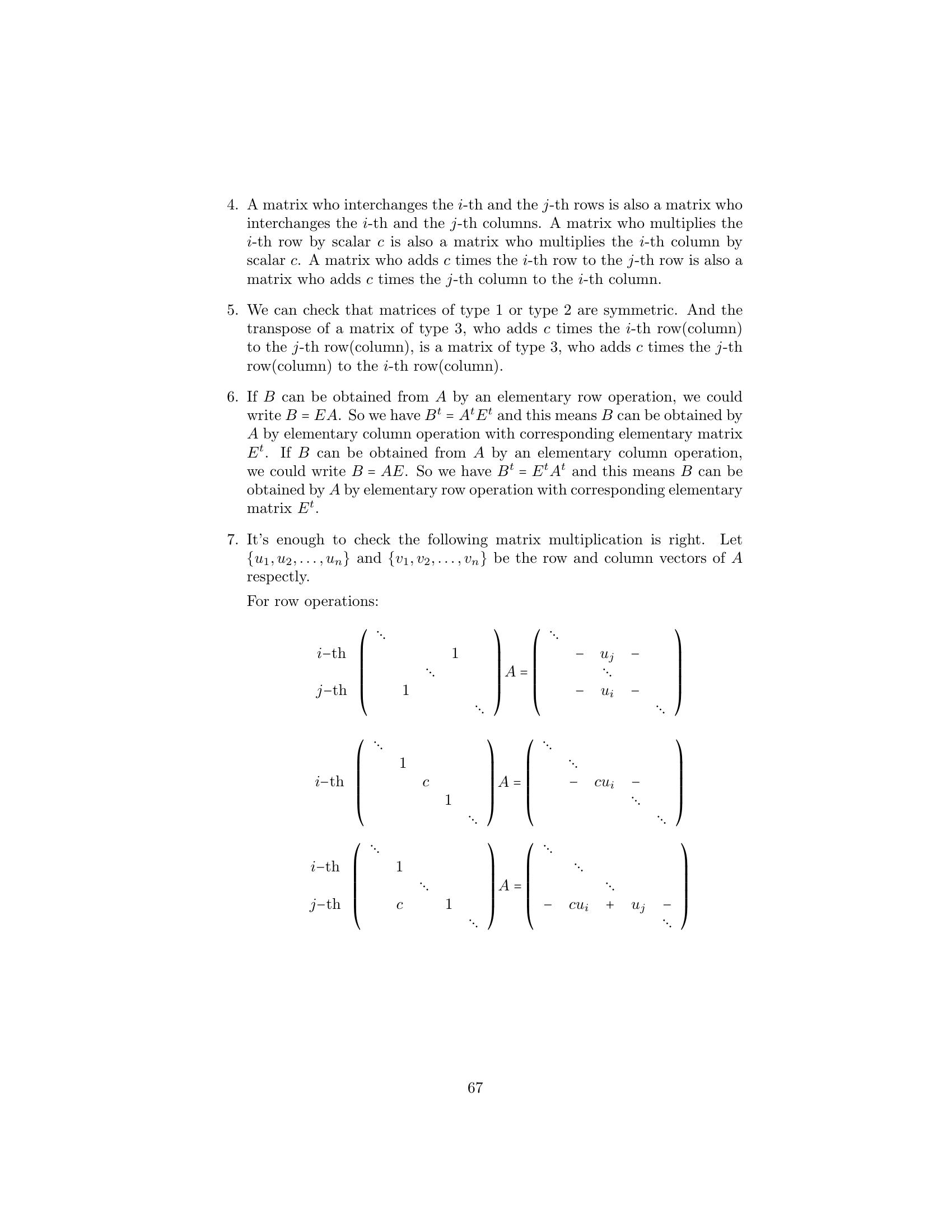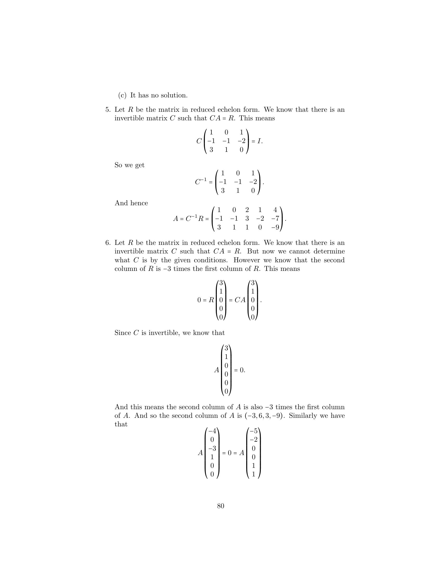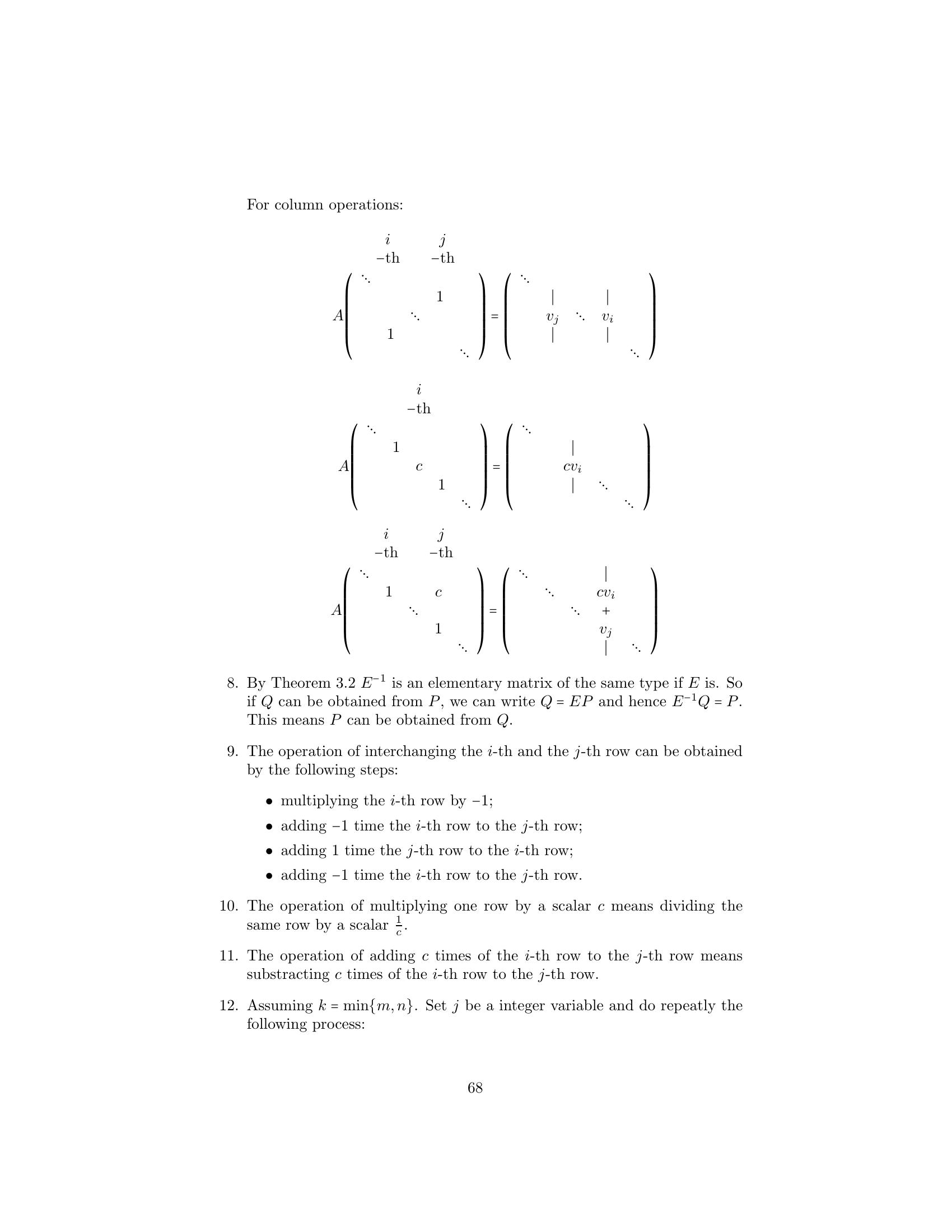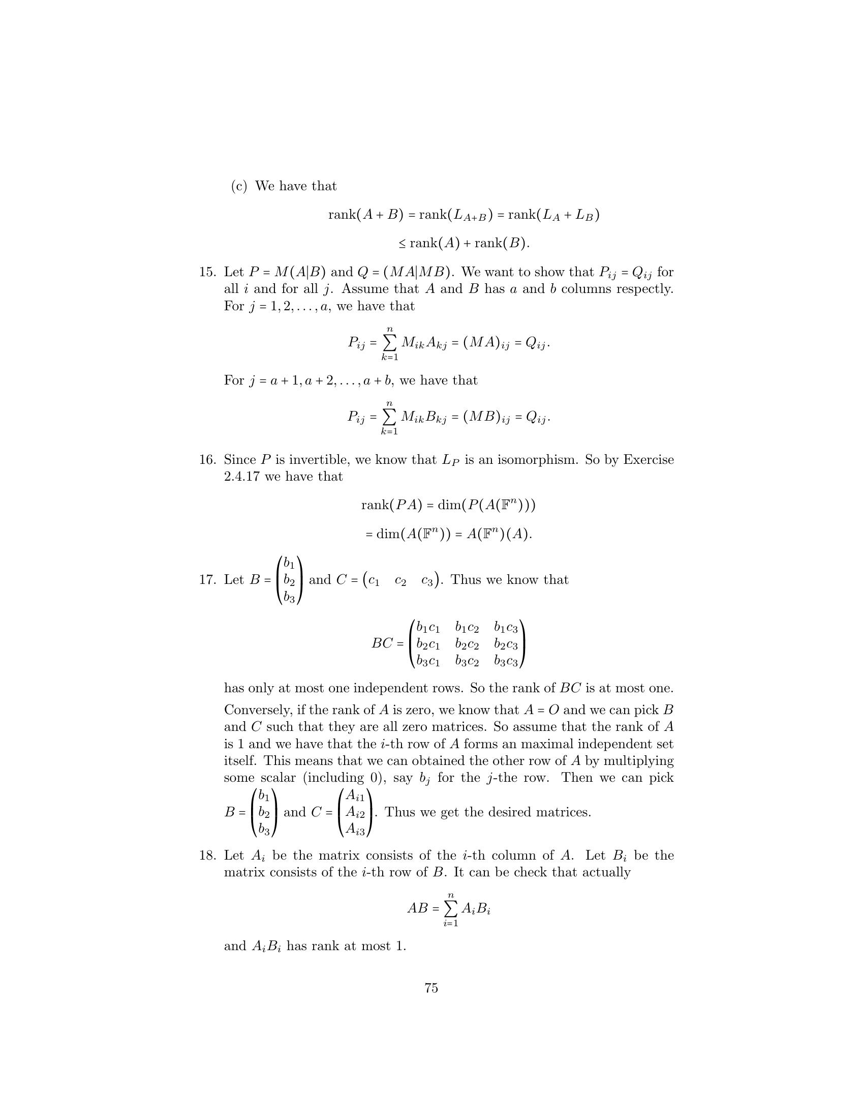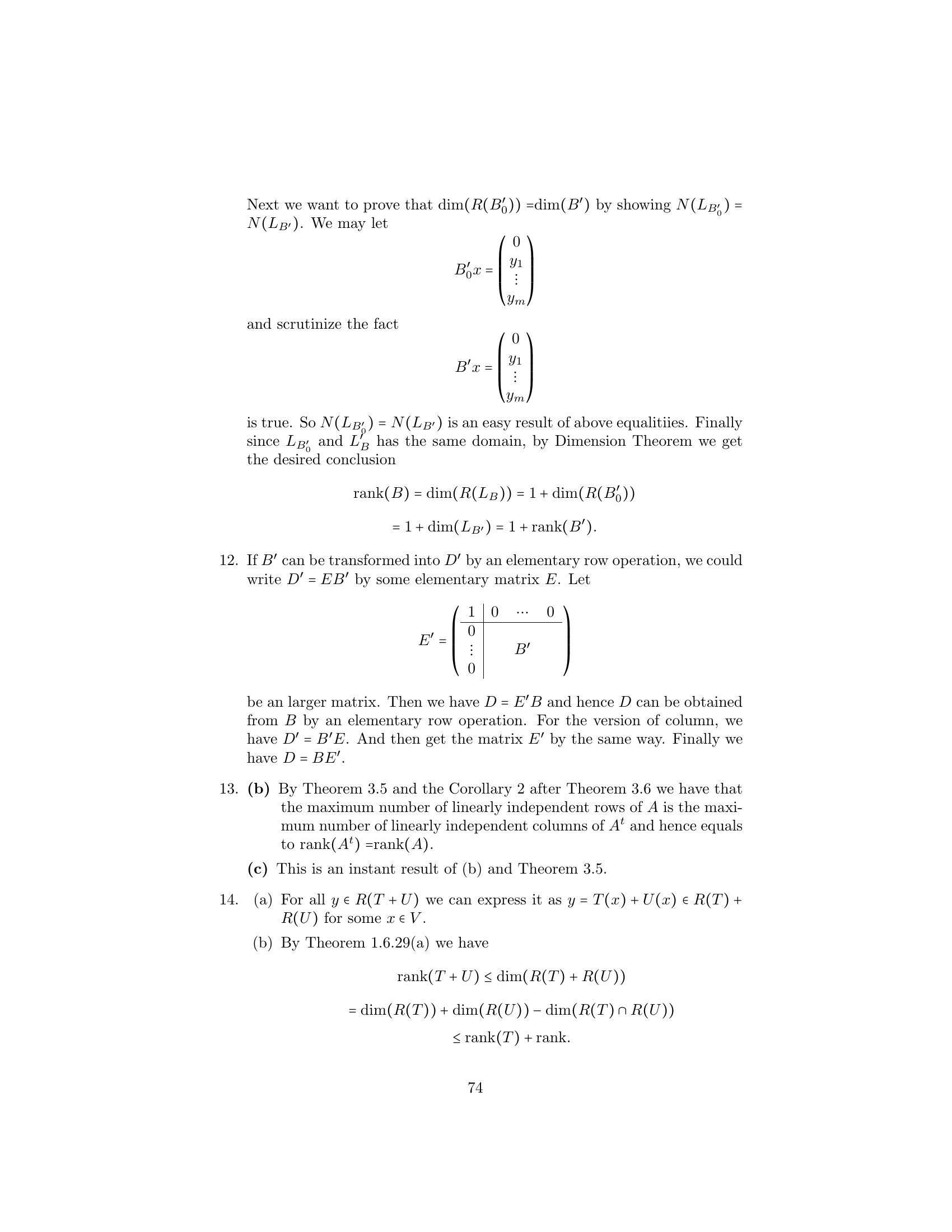 1. Label the following statements as true or false. (a) An elementary matrix is always square. (b) The only entries of an elementary matrix are zeros and ones. (c) The n × n identity matrix is an elementary matrix. (d) The product of two n × n elementary matrices is an elementary matrix. (e) The inverse of an elementary matrix is an elementary matrix. (f ) The sum of two n×n elementary matrices is an elementary matrix. (g) The transpose of an elementary matrix is an elementary matrix. (h) If B is a matrix that can be obtained by performing an elementary row operation on a matrix A, then B can also be obtained by performing an elementary column operation on A. (i) If B is a matrix that can be obtained by performing an elemen- tary row operation on a matrix A, then A can be obtained by performing an elementary row operation on B. 2. Let ⎛ ⎞ ⎛ ⎞ ⎛ ⎞ 1 2 3 1 0 3 1 0 3 A = ⎝1 0 1⎠ , B = ⎝1 −2 1⎠ , and C = ⎝0 −2 −2⎠ . 1 −1 1 1 −3 1 1 −3 1 Find an elementary operation that transforms A into B and an elemen- tary operation that transforms B into C. By means of several additional operations, transform C into I3 . 3. Use the proof of Theorem 3.2 to obtain the inverse of each of the fol- lowing elementary matrices. ⎛ ⎞ ⎛ ⎞ ⎛ ⎞ 0 0 1 1 0 0 1 0 0 (a) ⎝0 1 0⎠ (b) ⎝0 3 0⎠ (c) ⎝ 0 1 0⎠ 1 0 0 0 0 1 −2 0 1 4.Prove the assertion made on page 149: Any elementary n×n matrix can be obtained in at least two ways—either by performing an elementary row operation on In or by performing an elementary column operation on In . 5.6.Prove that E is an elementary matrix if and only if E t is. Let A be an m × n matrix. Prove that if B can be obtained from A by an elementary row [column] operation, then B t can be obtained from At by the corresponding elementary column [row] operation. 7. Prove Theorem 3.1. 152 Chap. 3 Elementary Matrix Operations and Systems of Linear Equations 8.Prove that if a matrix Q can be obtained from a matrix P by an elemen- tary row operation, then P can be obtained from Q by an elementary matrix of the same type. Hint: Treat each type of elementary row operation separately. 9.Prove that any elementary row [column] operation of type 1 can be obtained by a succession of three elementary row [column] operations of type 3 followed by one elementary row [column] operation of type 2. 10. Prove that any elementary row [column] operation of type 2 can be obtained by dividing some row [column] by a nonzero scalar. 11. Prove that any elementary row [column] operation of type 3 can be obtained by subtracting a multiple of some row [column] from another row [column]. 12. Let A be an m × n matrix. Prove that there exists a sequence of elementary row operations of types 1 and 3 that transforms A into an upper triangular matrix. 1. Label the following statements as true or false. (a)(b)(c)(d)(e)(f )(g)(h)(i)The rank of a matrix is equal to the number of its nonzero columns. The product of two matrices always has rank equal to the lesser of the ranks of the two matrices. The m × n zero matrix is the only m × n matrix having rank 0. Elementary row operations preserve rank. Elementary column operations do not necessarily preserve rank. The rank of a matrix is equal to the maximum number of linearly independent rows in the matrix. The inverse of a matrix can be computed exclusively by means of elementary row operations. The rank of an n × n matrix is at most n. An n × n matrix having rank n is invertible. 2. Find the rank of the following matrices. ⎛ ⎞ ⎛ ⎞ 1 1 0 1 1 0 (a) ⎝0 1 1⎠ (b) ⎝2 1 1⎠ (c) 1 0 2 1 1 4 1 1 0 1 1 1 166 Chap. 3 Elementary Matrix Operations and Systems of Linear Equations ⎛ ⎞ 1 2 3 1 1 1 2 1 ⎜1 4 0 1 2⎟ (d) (e) ⎜ ⎟ 2 4 2 ⎝0 2 −3 0 1⎠ 1 0 0 0 0 ⎛ ⎞ ⎛ ⎞ 1 2 0 1 1 1 1 0 1 ⎜ 2 4 1 3 0⎟ ⎜2 2 0 2⎟ (f ) ⎜ ⎟ (g) ⎜ ⎟ ⎝ 3 6 2 5 1⎠ ⎝1 1 0 1⎠ −4 −8 1 −3 1 1 1 0 1 3.Prove that for any m × n matrix A, rank(A) = 0 if and only if A is the zero matrix. 4. Use elementary row and column operations to transform each of the following matrices into a matrix D satisfying the conditions of Theo- rem 3.6, and then determine the rank of each matrix. ⎛ ⎞ ⎛ ⎞ 1 1 1 2 2 1 (a) ⎝2 0 −1 2⎠ (b) ⎝−1 2⎠ 1 1 1 2 2 1 5. For each of the following matrices, compute the rank and the inverse if it exists. ⎛ ⎞ 1 2 1 (a) 1 2 (b) 1 2 (c) ⎝1 3 4⎠ 1 1 2 4 2 3 −1 ⎛ ⎞ ⎛ ⎞ ⎛ ⎞ 0 −2 4 1 2 1 1 2 1 (d) ⎝1 1 −1⎠ (e) ⎝−1 1 2⎠ (f ) ⎝1 0 1⎠ 2 4 −5 1 0 1 1 1 1 ⎛ ⎞ ⎛ ⎞ 1 2 1 0 1 0 1 1 (g) ⎜ ⎜ 2 5 5 1⎟ ⎟ (h) ⎜1 ⎜ 1 −1 2⎟ ⎟ ⎝−2 −3 0 3⎠ ⎝2 0 1 0⎠ 3 4 −2 −3 0 −1 1 −3 6.For each of the following linear transformations T, determine whether T is invertible, and compute T−1 if it exists. (a) T : P2 (R) → P2 (R) defined by T(f (x)) = f (x) + 2f (x) − f (x). (b) T : P2 (R) → P2 (R) defined by T(f (x)) = (x + 1)f (x). (c) T : R3 → R3 defined by T(a1 , a2 , a3 ) = (a 1 + 2a2 + a3 , −a1 + a2 + 2a3 , a1 + a3 ). Sec. 3.2 The Rank of a Matrix and Matrix Inverses 167 (d) T : R3 → P2 (R) defined by T(a1 , a2 , a3 ) = (a1 + a2 + a3 ) + (a1 − a2 + a3 )x + a1 x2 . (e) T : P2 (R) → R3 defined by T(f (x)) = (f (−1), f (0), f (1)). (f ) T : M2×2 (R) → R4 defined by T(A) = (tr(A), tr(At ), tr(EA), tr(AE)), where 0 1 E = . 1 0 7. Express the invertible matrix ⎛ ⎞ 1 2 1 ⎝1 0 1⎠ 1 1 2 as a product of elementary matrices. 8. Let A be an m × n matrix. Prove that if c is any nonzero scalar, then rank(cA) = rank(A). 9. Complete the proof of the corollary to Theorem 3.4 by showing that elementary column operations preserve rank. 10. Prove Theorem 3.6 for the case that A is an m × 1 matrix. 11. Let ⎛ ⎞ 1 0 ··· 0 ⎜ 0 ⎟ ⎜ ⎟ B = ⎜ ⎝ .. . B ⎟ ⎠ , 0 where B is an m × n submatrix of B. Prove that if rank(B) = r, then rank(B ) = r − 1. 12. Let B and D be m × n matrices, and let B a