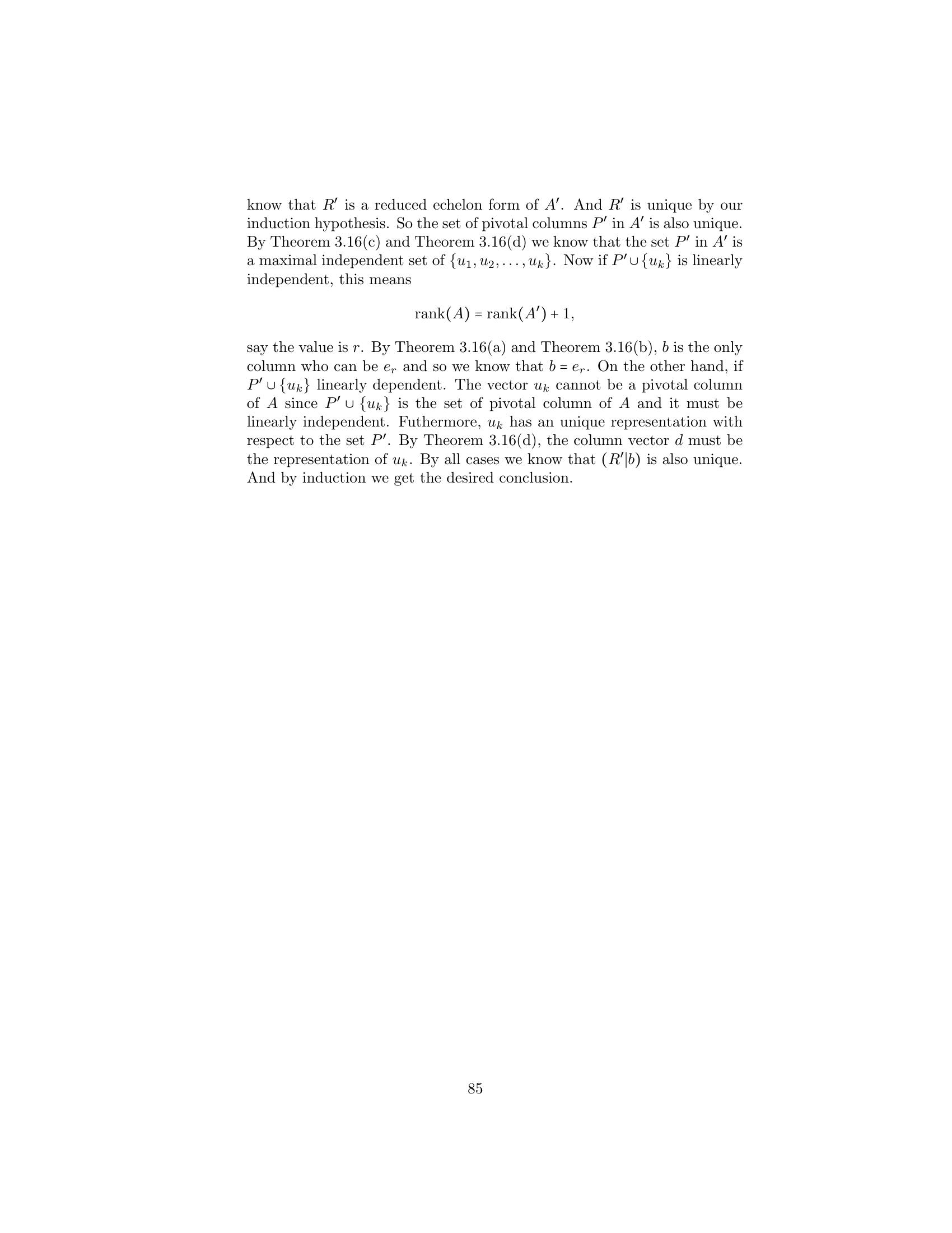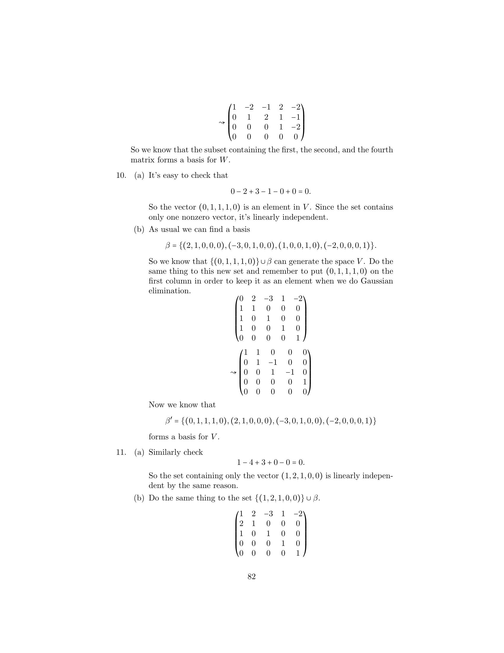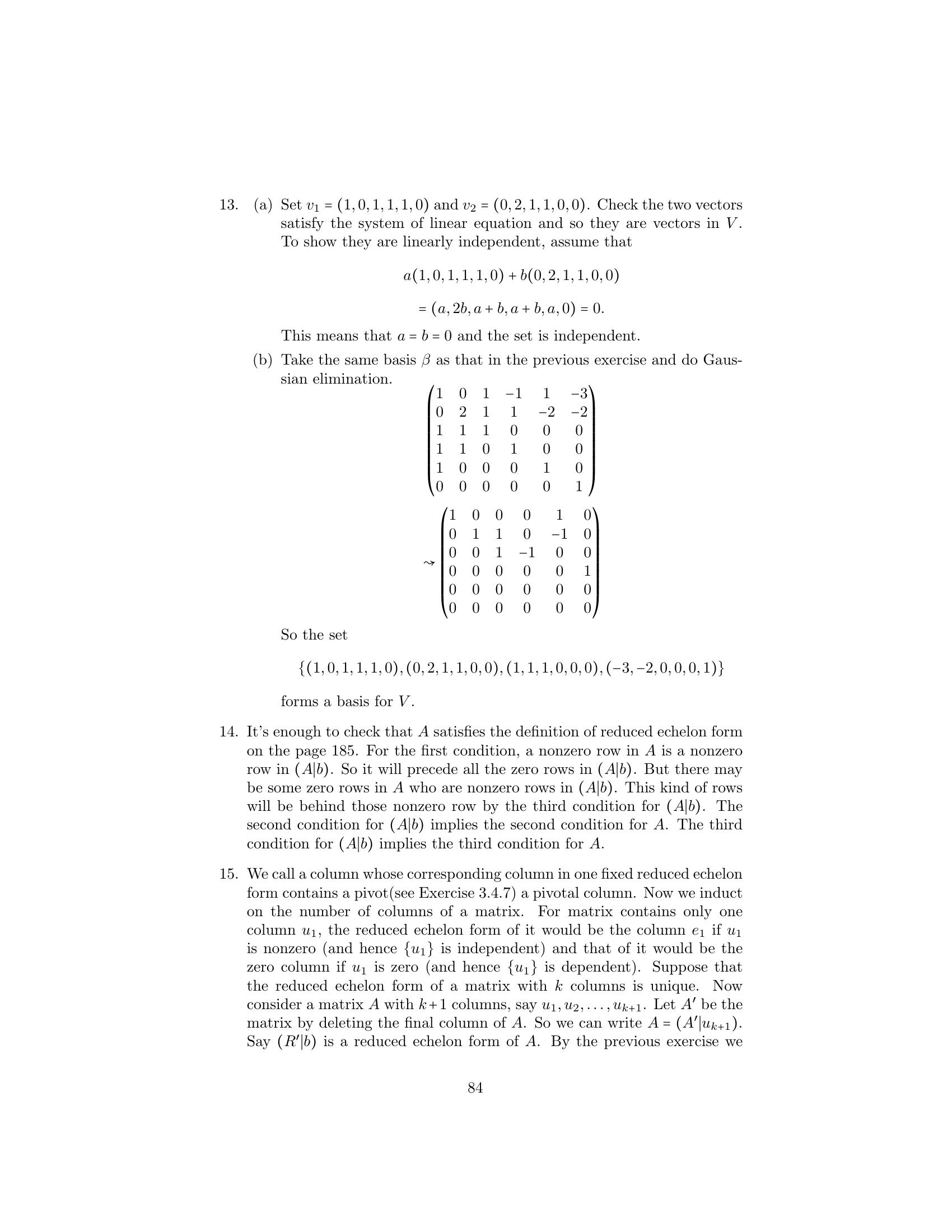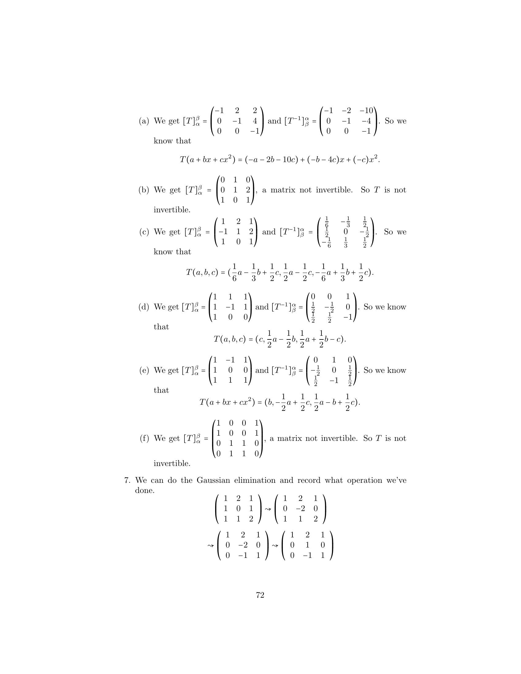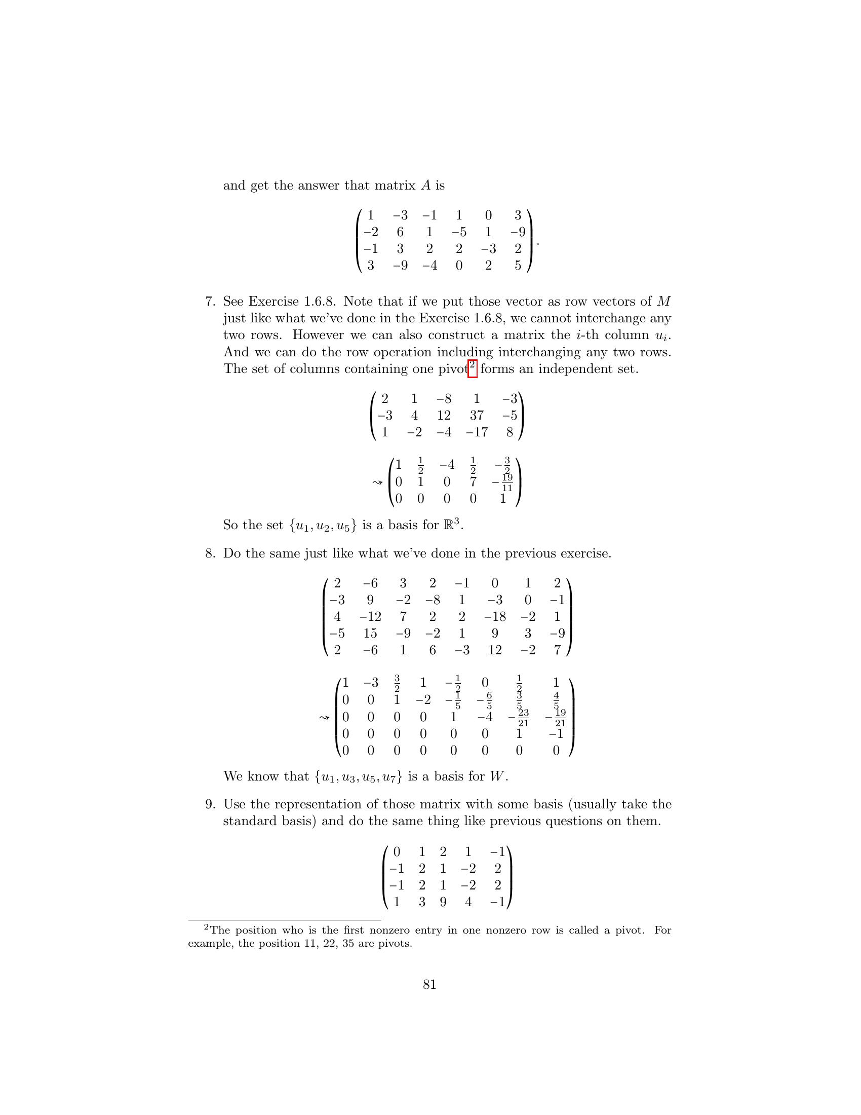 1. Label the following statements as true or false. (a) An elementary matrix is always square. (b) The only entries of an elementary matrix are zeros and ones. (c) The n × n identity matrix is an elementary matrix. (d) The product of two n × n elementary matrices is an elementary matrix. (e) The inverse of an elementary matrix is an elementary matrix. (f ) The sum of two n×n elementary matrices is an elementary matrix. (g) The transpose of an elementary matrix is an elementary matrix. (h) If B is a matrix that can be obtained by performing an elementary row operation on a matrix A, then B can also be obtained by performing an elementary column operation on A. (i) If B is a matrix that can be obtained by performing an elemen- tary row operation on a matrix A, then A can be obtained by performing an elementary row operation on B. 2. Let ⎛ ⎞ ⎛ ⎞ ⎛ ⎞ 1 2 3 1 0 3 1 0 3 A = ⎝1 0 1⎠ , B = ⎝1 −2 1⎠ , and C = ⎝0 −2 −2⎠ . 1 −1 1 1 −3 1 1 −3 1 Find an elementary operation that transforms A into B and an elemen- tary operation that transforms B into C. By means of several additional operations, transform C into I3 . 3. Use the proof of Theorem 3.2 to obtain the inverse of each of the fol- lowing elementary matrices. ⎛ ⎞ ⎛ ⎞ ⎛ ⎞ 0 0 1 1 0 0 1 0 0 (a) ⎝0 1 0⎠ (b) ⎝0 3 0⎠ (c) ⎝ 0 1 0⎠ 1 0 0 0 0 1 −2 0 1 4.Prove the assertion made on page 149: Any elementary n×n matrix can be obtained in at least two ways—either by performing an elementary row operation on In or by performing an elementary column operation on In . 5.6.Prove that E is an elementary matrix if and only if E t is. Let A be an m × n matrix. Prove that if B can be obtained from A by an elementary row [column] operation, then B t can be obtained from At by the corresponding elementary column [row] operation. 7. Prove Theorem 3.1. 152 Chap. 3 Elementary Matrix Operations and Systems of Linear Equations 8.Prove that if a matrix Q can be obtained from a matrix P by an elemen- tary row operation, then P can be obtained from Q by an elementary matrix of the same type. Hint: Treat each type of elementary row operation separately. 9.Prove that any elementary row [column] operation of type 1 can be obtained by a succession of three elementary row [column] operations of type 3 followed by one elementary row [column] operation of type 2. 10. Prove that any elementary row [column] operation of type 2 can be obtained by dividing some row [column] by a nonzero scalar. 11. Prove that any elementary row [column] operation of type 3 can be obtained by subtracting a multiple of some row [column] from another row [column]. 12. Let A be an m × n matrix. Prove that there exists a sequence of elementary row operations of types 1 and 3 that transforms A into an upper triangular matrix. 1. Label the following statements as true or false. (a)(b)(c)(d)(e)(f )(g)(h)(i)The rank of a matrix is equal to the number of its nonzero columns. The product of two matrices always has rank equal to the lesser of the ranks of the two matrices. The m × n zero matrix is the only m × n matrix having rank 0. Elementary row operations preserve rank. Elementary column operations do not necessarily preserve rank. The rank of a matrix is equal to the maximum number of linearly independent rows in the matrix. The inverse of a matrix can be computed exclusively by means of elementary row operations. The rank of an n × n matrix is at most n. An n × n matrix having rank n is invertible. 2. Find the rank of the following matrices. ⎛ ⎞ ⎛ ⎞ 1 1 0 1 1 0 (a) ⎝0 1 1⎠ (b) ⎝2 1 1⎠ (c) 1 0 2 1 1 4 1 1 0 1 1 1 166 Chap. 3 Elementary Matrix Operations and Systems of Linear Equations ⎛ ⎞ 1 2 3 1 1 1 2 1 ⎜1 4 0 1 2⎟ (d) (e) ⎜ ⎟ 2 4 2 ⎝0 2 −3 0 1⎠ 1 0 0 0 0 ⎛ ⎞ ⎛ ⎞ 1 2 0 1 1 1 1 0 1 ⎜ 2 4 1 3 0⎟ ⎜2 2 0 2⎟ (f ) ⎜ ⎟ (g) ⎜ ⎟ ⎝ 3 6 2 5 1⎠ ⎝1 1 0 1⎠ −4 −8 1 −3 1 1 1 0 1 3.Prove that for any m × n matrix A, rank(A) = 0 if and only if A is the zero matrix. 4. Use elementary row and column operations to transform each of the following matrices into a matrix D satisfying the conditions of Theo- rem 3.6, and then determine the rank of each matrix. ⎛ ⎞ ⎛ ⎞ 1 1 1 2 2 1 (a) ⎝2 0 −1 2⎠ (b) ⎝−1 2⎠ 1 1 1 2 2 1 5. For each of the following matrices, compute the rank and the inverse if it exists. ⎛ ⎞ 1 2 1 (a) 1 2 (b) 1 2 (c) ⎝1 3 4⎠ 1 1 2 4 2 3 −1 ⎛ ⎞ ⎛ ⎞ ⎛ ⎞ 0 −2 4 1 2 1 1 2 1 (d) ⎝1 1 −1⎠ (e) ⎝−1 1 2⎠ (f ) ⎝1 0 1⎠ 2 4 −5 1 0 1 1 1 1 ⎛ ⎞ ⎛ ⎞ 1 2 1 0 1 0 1 1 (g) ⎜ ⎜ 2 5 5 1⎟ ⎟ (h) ⎜1 ⎜ 1 −1 2⎟ ⎟ ⎝−2 −3 0 3⎠ ⎝2 0 1 0⎠ 3 4 −2 −3 0 −1 1 −3 6.For each of the following linear transformations T, determine whether T is invertible, and compute T−1 if it exists. (a) T : P2 (R) → P2 (R) defined by T(f (x)) = f (x) + 2f (x) − f (x). (b) T : P2 (R) → P2 (R) defined by T(f (x)) = (x + 1)f (x). (c) T : R3 → R3 defined by T(a1 , a2 , a3 ) = (a 1 + 2a2 + a3 , −a1 + a2 + 2a3 , a1 + a3 ). Sec. 3.2 The Rank of a Matrix and Matrix Inverses 167 (d) T : R3 → P2 (R) defined by T(a1 , a2 , a3 ) = (a1 + a2 + a3 ) + (a1 − a2 + a3 )x + a1 x2 . (e) T : P2 (R) → R3 defined by T(f (x)) = (f (−1), f (0), f (1)). (f ) T : M2×2 (R) → R4 defined by T(A) = (tr(A), tr(At ), tr(EA), tr(AE)), where 0 1 E = . 1 0 7. Express the invertible matrix ⎛ ⎞ 1 2 1 ⎝1 0 1⎠ 1 1 2 as a product of elementary matrices. 8. Let A be an m × n matrix. Prove that if c is any nonzero scalar, then rank(cA) = rank(A). 9. Complete the proof of the corollary to Theorem 3.4 by showing that elementary column operations preserve rank. 10. Prove Theorem 3.6 for the case that A is an m × 1 matrix. 11. Let ⎛ ⎞ 1 0 ··· 0 ⎜ 0 ⎟ ⎜ ⎟ B = ⎜ ⎝ .. . B ⎟ ⎠ , 0 where B is an m × n submatrix of B. Prove that if rank(B) = r, then rank(B ) = r − 1. 12. Let B and D be m × n matrices, and let B a