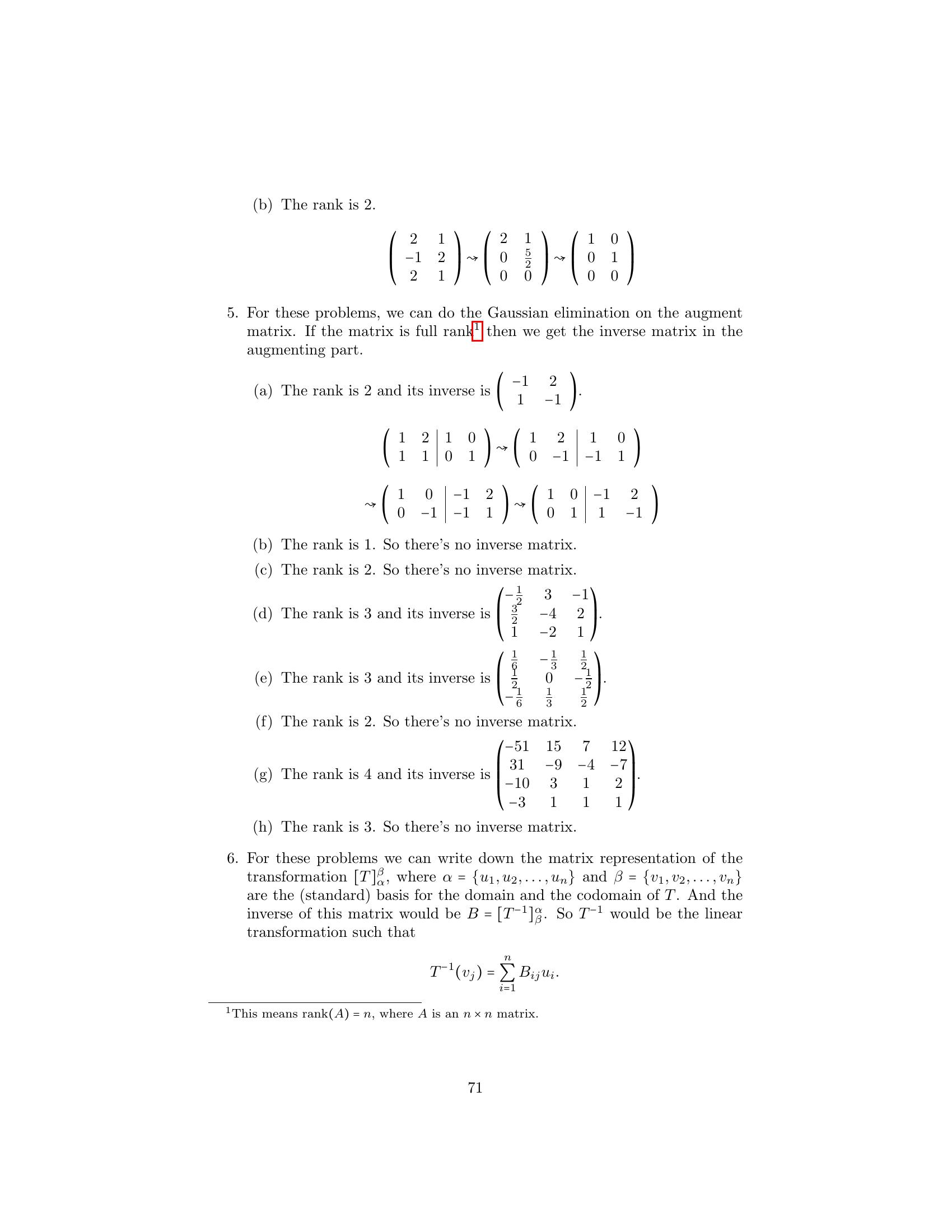 1. Label the following statements as true or false. (a) An elementary matrix is always square. (b) The only entries of an elementary matrix are zeros and ones. (c) The n × n identity matrix is an elementary matrix. (d) The product of two n × n elementary matrices is an elementary matrix. (e) The inverse of an elementary matrix is an elementary matrix. (f ) The sum of two n×n elementary matrices is an elementary matrix. (g) The transpose of an elementary matrix is an elementary matrix. (h) If B is a matrix that can be obtained by performing an elementary row operation on a matrix A, then B can also be obtained by performing an elementary column operation on A. (i) If B is a matrix that can be obtained by performing an elemen- tary row operation on a matrix A, then A can be obtained by performing an elementary row operation on B. 2. Let ⎛ ⎞ ⎛ ⎞ ⎛ ⎞ 1 2 3 1 0 3 1 0 3 A = ⎝1 0 1⎠ , B = ⎝1 −2 1⎠ , and C = ⎝0 −2 −2⎠ . 1 −1 1 1 −3 1 1 −3 1 Find an elementary operation that transforms A into B and an elemen- tary operation that transforms B into C. By means of several additional operations, transform C into I3 . 3. Use the proof of Theorem 3.2 to obtain the inverse of each of the fol- lowing elementary matrices. ⎛ ⎞ ⎛ ⎞ ⎛ ⎞ 0 0 1 1 0 0 1 0 0 (a) ⎝0 1 0⎠ (b) ⎝0 3 0⎠ (c) ⎝ 0 1 0⎠ 1 0 0 0 0 1 −2 0 1 4.Prove the assertion made on page 149: Any elementary n×n matrix can be obtained in at least two ways—either by performing an elementary row operation on In or by performing an elementary column operation on In . 5.6.Prove that E is an elementary matrix if and only if E t is. Let A be an m × n matrix. Prove that if B can be obtained from A by an elementary row [column] operation, then B t can be obtained from At by the corresponding elementary column [row] operation. 7. Prove Theorem 3.1. 152 Chap. 3 Elementary Matrix Operations and Systems of Linear Equations 8.Prove that if a matrix Q can be obtained from a matrix P by an elemen- tary row operation, then P can be obtained from Q by an elementary matrix of the same type. Hint: Treat each type of elementary row operation separately. 9.Prove that any elementary row [column] operation of type 1 can be obtained by a succession of three elementary row [column] operations of type 3 followed by one elementary row [column] operation of type 2. 10. Prove that any elementary row [column] operation of type 2 can be obtained by dividing some row [column] by a nonzero scalar. 11. Prove that any elementary row [column] operation of type 3 can be obtained by subtracting a multiple of some row [column] from another row [column]. 12. Let A be an m × n matrix. Prove that there exists a sequence of elementary row operations of types 1 and 3 that transforms A into an upper triangular matrix. 1. Label the following statements as true or false. (a)(b)(c)(d)(e)(f )(g)(h)(i)The rank of a matrix is equal to the number of its nonzero columns. The product of two matrices always has rank equal to the lesser of the ranks of the two matrices. The m × n zero matrix is the only m × n matrix having rank 0. Elementary row operations preserve rank. Elementary column operations do not necessarily preserve rank. The rank of a matrix is equal to the maximum number of linearly independent rows in the matrix. The inverse of a matrix can be computed exclusively by means of elementary row operations. The rank of an n × n matrix is at most n. An n × n matrix having rank n is invertible. 2. Find the rank of the following matrices. ⎛ ⎞ ⎛ ⎞ 1 1 0 1 1 0  (a) ⎝0 1 1⎠ (b) ⎝2 1 1⎠ (c) 1 0 2 1 1 4 1 1 0 1 1 1 166 Chap. 3 Elementary Matrix Operations and Systems of Linear Equations ⎛ ⎞  1 2 3 1 1 1 2 1 ⎜1 4 0 1 2⎟ (d) (e) ⎜ ⎟ 2 4 2 ⎝0 2 −3 0 1⎠ 1 0 0 0 0 ⎛ ⎞ ⎛ ⎞ 1 2 0 1 1 1 1 0 1 ⎜ 2 4 1 3 0⎟ ⎜2 2 0 2⎟ (f ) ⎜ ⎟ (g) ⎜ ⎟ ⎝ 3 6 2 5 1⎠ ⎝1 1 0 1⎠ −4 −8 1 −3 1 1 1 0 1 3.Prove that for any m × n matrix A, rank(A) = 0 if and only if A is the zero matrix. 4. Use elementary row and column operations to transform each of the following matrices into a matrix D satisfying the conditions of Theo- rem 3.6, and then determine the rank of each matrix. ⎛ ⎞ ⎛ ⎞ 1 1 1 2 2 1 (a) ⎝2 0 −1 2⎠ (b) ⎝−1 2⎠ 1 1 1 2 2 1 5. For each of the following matrices, compute the rank and the inverse if it exists. ⎛ ⎞   1 2 1 (a) 1 2 (b) 1 2 (c) ⎝1 3 4⎠ 1 1 2 4 2 3 −1 ⎛ ⎞ ⎛ ⎞ ⎛ ⎞ 0 −2 4 1 2 1 1 2 1 (d) ⎝1 1 −1⎠ (e) ⎝−1 1 2⎠ (f ) ⎝1 0 1⎠ 2 4 −5 1 0 1 1 1 1 ⎛ ⎞ ⎛ ⎞ 1 2 1 0 1 0 1 1 (g) ⎜ ⎜ 2 5 5 1⎟ ⎟ (h) ⎜1 ⎜ 1 −1 2⎟ ⎟ ⎝−2 −3 0 3⎠ ⎝2 0 1 0⎠ 3 4 −2 −3 0 −1 1 −3 6.For each of the following linear transformations T, determine whether T is invertible, and compute T−1 if it exists. (a) T : P2 (R) → P2 (R) defined by T(f (x)) = f  (x) + 2f  (x) − f (x). (b) T : P2 (R) → P2 (R) defined by T(f (x)) = (x + 1)f  (x). (c) T : R3 → R3 defined by T(a1 , a2 , a3 ) = (a 1 + 2a2 + a3 , −a1 + a2 + 2a3 , a1 + a3 ). Sec. 3.2 The Rank of a Matrix and Matrix Inverses 167 (d) T : R3 → P2 (R) defined by T(a1 , a2 , a3 ) = (a1 + a2 + a3 ) + (a1 − a2 + a3 )x + a1 x2 . (e) T : P2 (R) → R3 defined by T(f (x)) = (f (−1), f (0), f (1)). (f ) T : M2×2 (R) → R4 defined by T(A) = (tr(A), tr(At ), tr(EA), tr(AE)), where  0 1 E = . 1 0 7. Express the invertible matrix ⎛ ⎞ 1 2 1 ⎝1 0 1⎠ 1 1 2 as a product of elementary matrices. 8. Let A be an m × n matrix. Prove that if c is any nonzero scalar, then rank(cA) = rank(A). 9. Complete the proof of the corollary to Theorem 3.4 by showing that elementary column operations preserve rank. 10. Prove Theorem 3.6 for the case that A is an m × 1 matrix. 11. Let ⎛ ⎞ 1 0 ··· 0 ⎜ 0 ⎟ ⎜ ⎟ B = ⎜ ⎝ .. . B  ⎟ ⎠ , 0 where B  is an m × n submatrix of B. Prove that if rank(B) = r, then rank(B  ) = r − 1. 12. Let B  and D  be m × n matrices