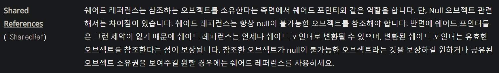 공식 문서 설명은 위와 같은데, 간단히 생각해서 null 을 가리킬 수 없는 TSharedPtr 라고 이해하면 편하다.