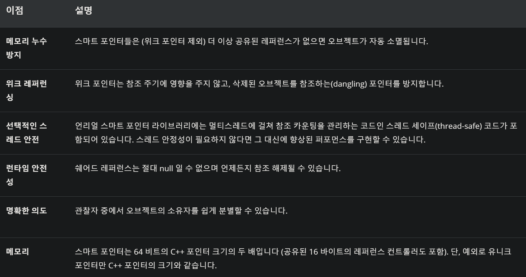 위의 스마트 포인터 라이브러리는 일반 C++ 객체를 위한 라이브러리이고, 언리얼 오브젝트에는 사용할 수 없다. UPROPERTY 가 붙은 언리얼 오브젝트는 가비지 컬렉터(GC)에 의해 자동으로 관리되기 때문이다.