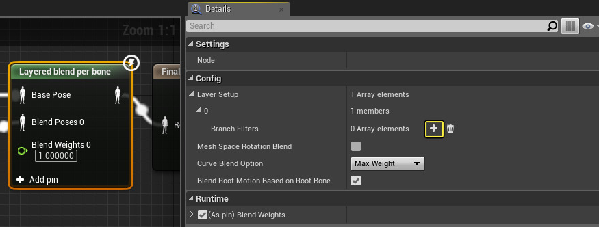 13. Layered Blend Per Bone 노드를 클릭하고 Blend Filters 설정을 변경한다.