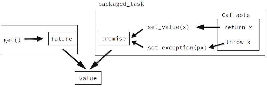 packaged_task 에 전달된 함수가 리턴할 때, 그 리턴값을 promise 에 set_value 하고, 만약 예외를 던졌다면 promise 에 set_exception 을 한다. 해당 future 은 packaged_task 가 리턴하는 future 에서 접근할 수 있다. 코드를 보자.
