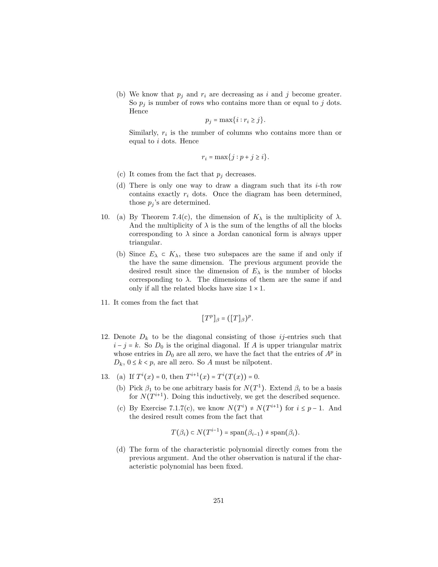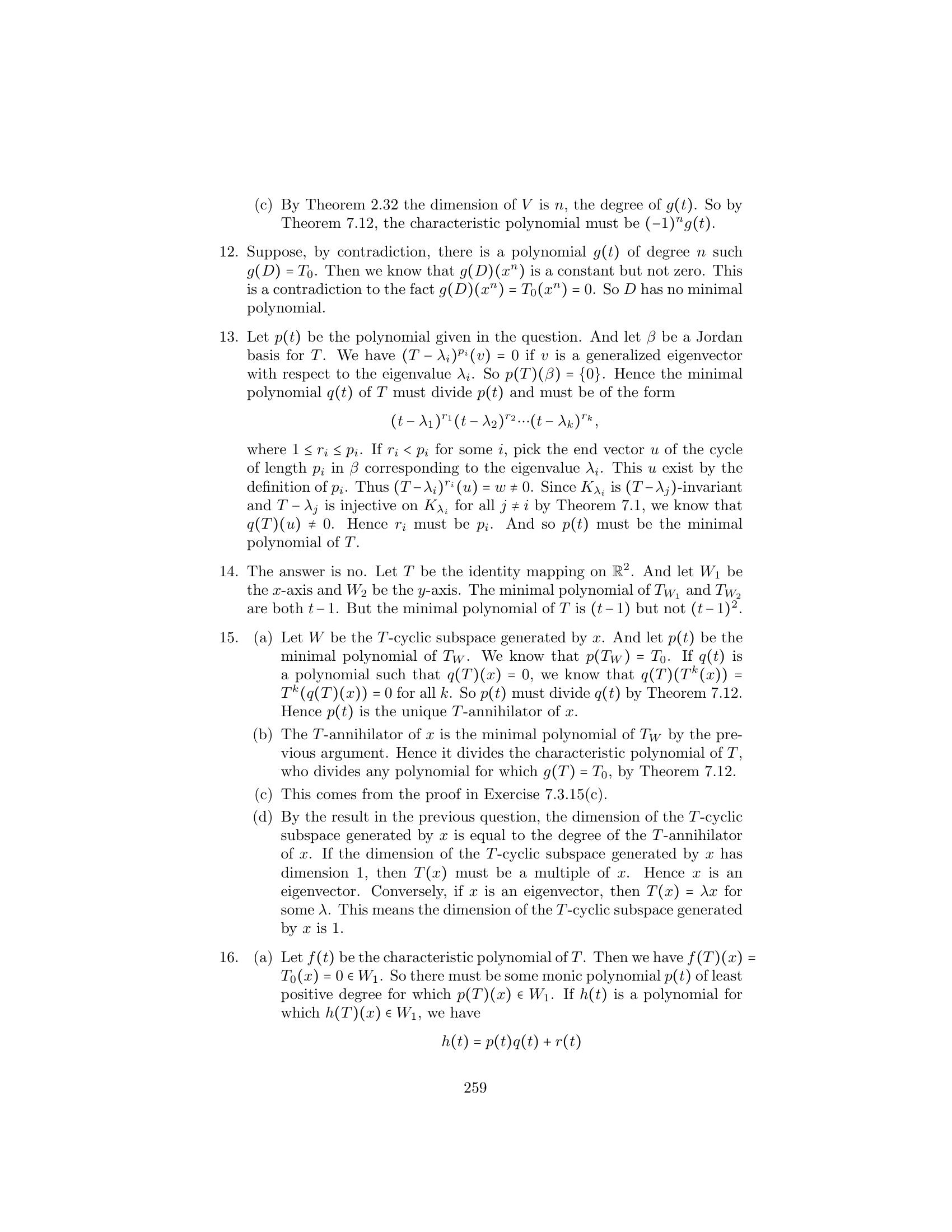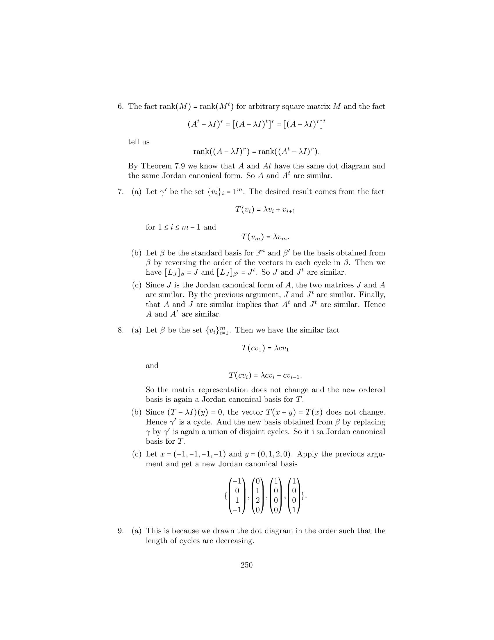 1.Label(a)(b)(c)(d)(e)(f )(g)(h)the following statements as true or false. Eigenvectors of a linear operator T are also generalized eigenvec- tors of T. It is possible for a generalized eigenvector of a linear operator T to correspond to a scalar that is not an eigenvalue of T. Any linear operator on a finite-dimensional vector space has a Jor- dan canonical form. A cycle of generalized eigenvectors is linearly independent. There is exactly one cycle of generalized eigenvectors correspond- ing to each eigenvalue of a linear operator on a finite-dimensional vector space. Let T be a linear operator on a finite-dimensional vector space whose characteristic polynomial splits, and let λ1 , λ2 , . . . , λk be the distinct eigenvalues of T. If, for each i, βi is a basis for Kλi , then β1 ∪ β2 ∪ · · · ∪ βk is a Jordan canonical basis for T. For any Jordan block J, the operator LJ has Jordan canonical form J. Let T be a linear operator on an n-dimensional vector space whose characteristic polynomial splits. Then, for any eigenvalue λ of T, Kλ = N((T − λI)n ). Sec. 7.1 The Jordan Canonical Form I 495 2. For each matrix A, find a basis for each generalized eigenspace of LA consisting of a union of disjoint cycles of generalized eigenvectors. Then find a Jordan canonical form J of A. 1 1 1 2 (a) A = (b) A = −1 3 3 2 ⎛ ⎞ ⎛ ⎞ 2 1 0 0 11 −4 −5 ⎜0 2 1 0⎟ (c) A = ⎝21 −8 −11⎠ (d) A = ⎜ ⎟ ⎝0 0 3 0⎠ 3 −1 0 0 1 −1 3 3. For each linear operator T, find a basis for each generalized eigenspace of T consisting of a union of disjoint cycles of generalized eigenvectors. Then find a Jordan canonical form J of T. (a) T is the linear operator on P2 (R) defined by T(f (x)) = 2f (x) − f (x) (b) V is the real vector space of functions spanned by the set of real valued functions {1, t, t2 , et , tet }, and T is the linear operator on V defined by T(f ) = f . 1 1 (c) T is the linear operator on M2×2 (R) defined by T(A) = · A 0 1 for all A ∈ M2×2 (R). (d) T(A) = 2A + At for all A ∈ M2×2 (R). 4. † Let T be a linear operator on a vector space V, and let γ be a cycle of generalized eigenvectors that corresponds to the eigenvalue λ. Prove that span(γ) is a T-invariant subspace of V. 5.Let γ1 , γ2 , . . . , γp be cycles of generalized eigenvectors of a linear op- erator T corresponding to an eigenvalue λ. Prove that if the initial eigenvectors are distinct, then the cycles are disjoint. 6.Let T : V → W be a linear transformation. Prove the following results. (a) N(T) = N(−T). (b) N(Tk ) = N((−T)k ). (c) If V = W (so that T is a linear operator on V) and λ is an eigen- value of T, then for any positive integer k 7.N((T − λIV )k ) = N((λIV − T)k ). Let U be a linear operator on a finite-dimensional vector space V. Prove the following results. (a) N(U) ⊆ N(U2 ) ⊆ · · · ⊆ N(U k ) ⊆ N(Uk+1 ) ⊆ · · · . 496 Chap. 7 Canonical Forms (b)(c)(d)(e)(f )If rank(Um ) = rank(Um+1 ) for some positive integer m, then rank(Um ) = rank(Uk ) for any positive integer k ≥ m. If rank(Um ) = rank(Um+1 ) for some positive integer m, then N(Um ) = N(Uk ) for any positive integer k ≥ m. Let T be a linear operator on V, and let λ be an eigenvalue of T. Prove that if rank((T−λI)m ) = rank((T−λI)m+1 ) for some integer m, then Kλ = N((T − λI)m ). Second Test for Diagonalizability. Let T be a linear operator on V whose characteristic polynomial splits, and let λ1 , λ 2 , . . . , λk be the distinct eigenvalues of T. Then T is diagonalizable if and only if rank(T − λI) = rank((T − λI)2 ) for 1 ≤ i ≤ k. Use (e) to obtain a simpler proof of Exercise 24 of Section 5.4: If T is a diagonalizable linear operator on a finite-dimensional vec- tor space V and W is a T-invariant subspace of V, then TW is diagonalizable. 8.Use Theorem 7.4 to prove that the vectors v1 , v2 , . . . , vk in the statement of Theorem 7.3 are unique. 9.Let T be a linear operator on a finite-dimensional vector space V whose characteristic polynomial splits. (a) Prove Theorem 7.5(b). (b) Suppose that β is a Jordan canonical basis for T, and let λ be an eigenvalue of T. Let β = β ∩ Kλ . Prove that β is a basis for Kλ . 10.11.Let T be a linear operator on a finite-dimensional vector space whose characteristic polynomial splits, and let λ be an eigenvalue of T. (a)(b)Suppose that γ is a basis for Kλ consisting of the union of q disjoint cycles of generalized eigenvectors. Prove that q ≤ dim(Eλ ). Let β be a Jordan canonical basis for T, and suppose that J = [T]β has q Jordan blocks with λ in the diagonal positions. Prove that q ≤ dim(Eλ ). Prove Corollary 2 to Theorem 7.7. Exercises 12 and 13 are concerned with direct sums of matrices, defined in Section 5.4 on page 320. 12. Prove Theorem 7.8. 13.Let T be a linear operator on a finite-dimensional vector space V such that the characteristic polynomial of T splits, and let λ1 , λ2 , . . . , λk be the distinct eigenvalues of T. For each i, let Ji be the Jordan canonical form of the restriction of T to Kλi . Prove that J = J1 ⊕ J2 ⊕ · · · ⊕ Jk is the Jordan canonical form of J. 1.Label the following statements as true or false. Assume that the char- acteristic polynomial of the matrix or linear operator splits. (a) The Jordan canonical form of a diagonal matrix is the matrix itself. (b) Let T be a linear operator on a finite-dimensional vector space V that has a Jordan canonical form J. If β is any basis for V, then the Jordan canonical form of [T]β is J. (c) Linear operators having the same characteristic polynomial are similar. (d) Matrices having the same Jordan canonical form are similar. (e) Every matrix is similar to its Jordan canonical form. (f ) Every linear operator with the characteristic polynomial (−1)n (t − λ)n has the same Jordan canonical form. (g) Every linear operator on a finite-dimensional vector space has a unique Jordan canonical basis. (h) The dot diagrams o