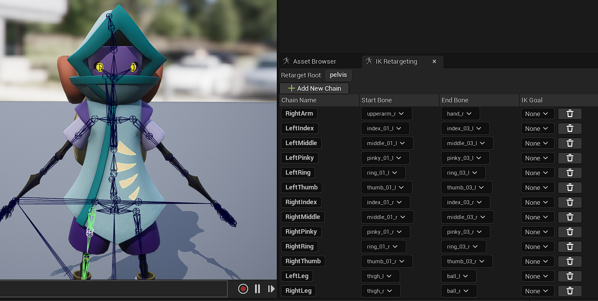 위의 원본 IK_Rig을 잘 보면 IK_Retargeting 에 Chain 이 설정되어 있다. 왼편의 Bone Hierarchy 를 잘 보면서, 우리가 리타깃하고자하는 IK_Rig 에 맞게 체인을 설정해주면 된다.