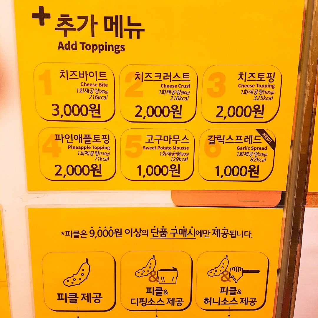 - Summary : Fine place to have cheap pizza, but It's worth it! It's the cheapest franchise, serving pizza and spaghetti. The cheapest one only costs 6000 Korean Won, which is about 5$. But I personally recommend pepperoni pizza, and it costs 7000 Korean Won(5.7$). They started as a only-takeout restaurant, but as they expand the buisness, they made some room for guests who eat inside the restaurant.