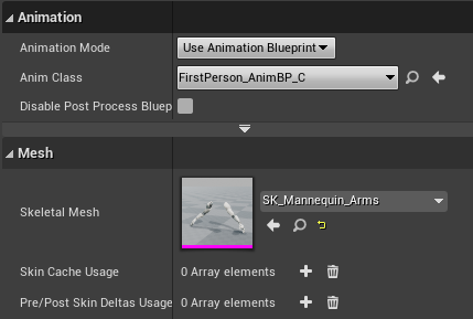 이를 해결하는 방법은 간단한데, 바로 FirstPersonBP (시작용 컨텐츠) 처럼, 기본으로 주어지는 Skeletal Mesh 를 Clear 하고, 카메라의 자식(Children)에 우리가 원하는 Skeletal Mesh 를 추가하는 것이다.
