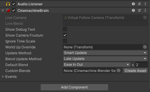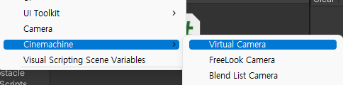 Cinemachine 에서 Virtual Camera 를 생성하고, MainCamera 에 CinemachineBrain 이라는 컴포넌트를 추가한다.
