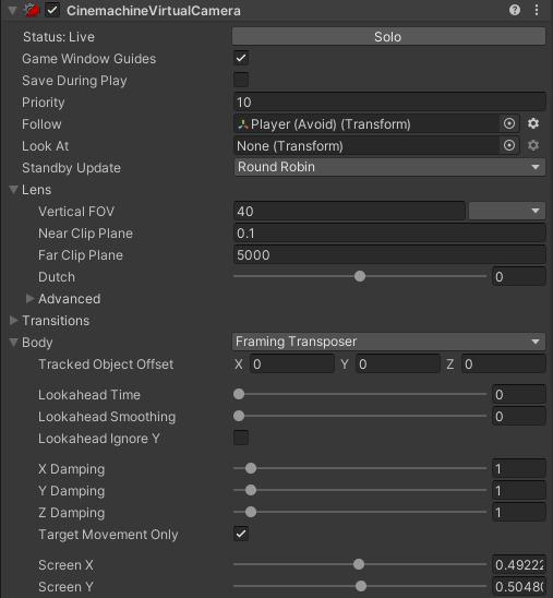 Virtual Follow Camera 의 Follow 부분에 플레이어를 설정하고, Body 부분을 Framing Transposer 로 바꾼다. 그럼 게임 뷰포트에서는 다음과 같이 보인다.