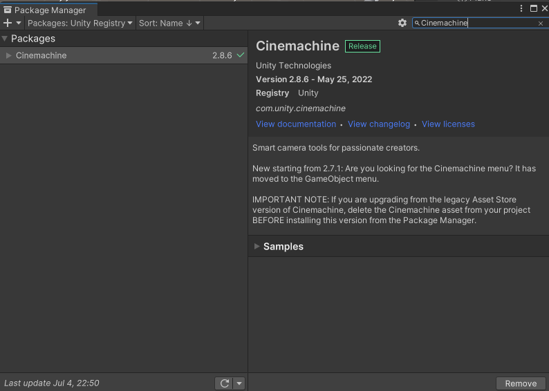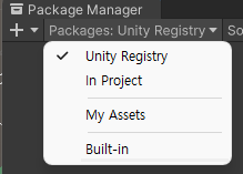 먼저, Window -> Package Manager 로 들어가서, Packages 설정을 Unity Registry 로 바꾼다.