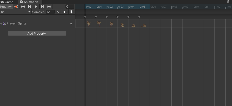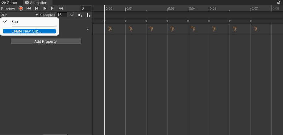 그럼 다음과 같이 해당하는 키프레임 위에 스프라이트들이 올라가는데, Samples 값을 조절해 속도를 조절할 수 있다. Samples 의 값은 1초당 스프라이트가 얼마나 자주 교체되는지를 의미한다.