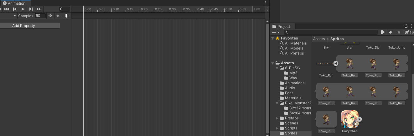 그 후, 우리가 만드려는 애니메이션에 필요한 스프라이트들을 Animation 창으로 드래그&드랍한다.