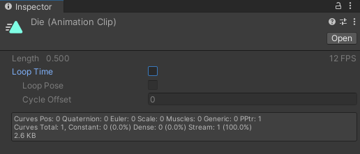 이제 Die 애니메이션 클립을 만들어 보자. Run 에서 Create New Clip... 을 누르고, Die.anim 으로 저장한다.