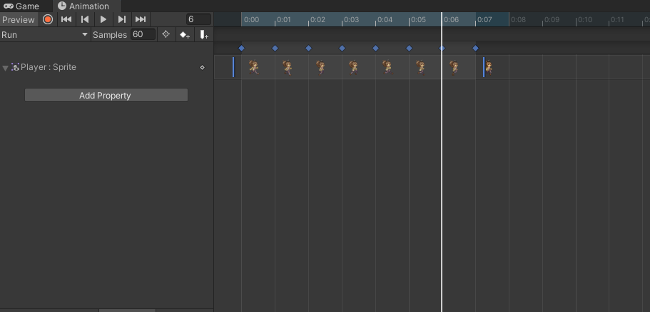 그럼 다음과 같이 해당하는 키프레임 위에 스프라이트들이 올라가는데, Samples 값을 조절해 속도를 조절할 수 있다. Samples 의 값은 1초당 스프라이트가 얼마나 자주 교체되는지를 의미한다.