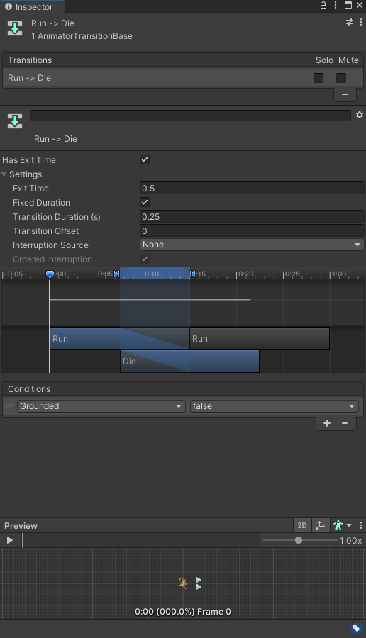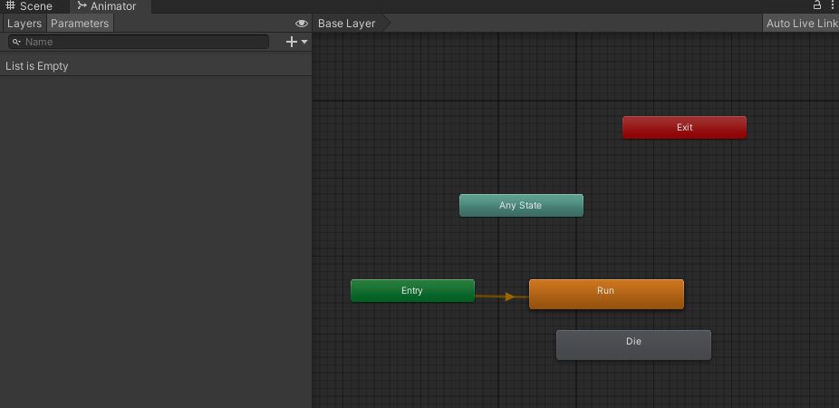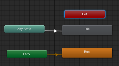 실습을 위해 Run -> Die 로 Transition 을 하나 만들었다.