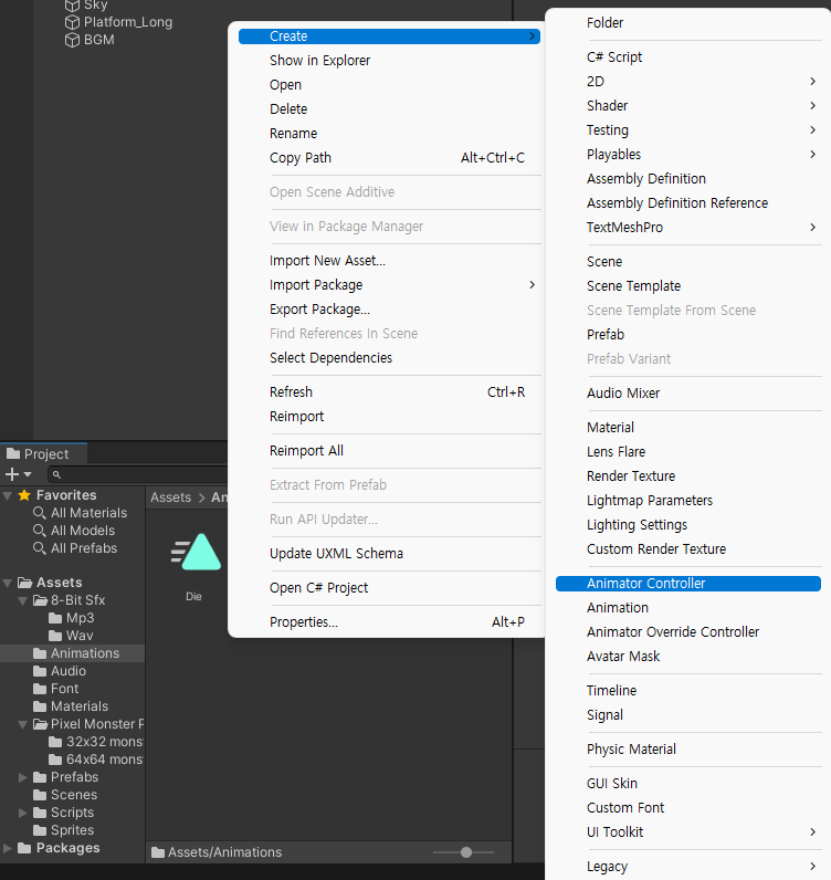 먼저 애니메이터 컨트롤러를 생성하자. Project 창에서 생성 가능하다.